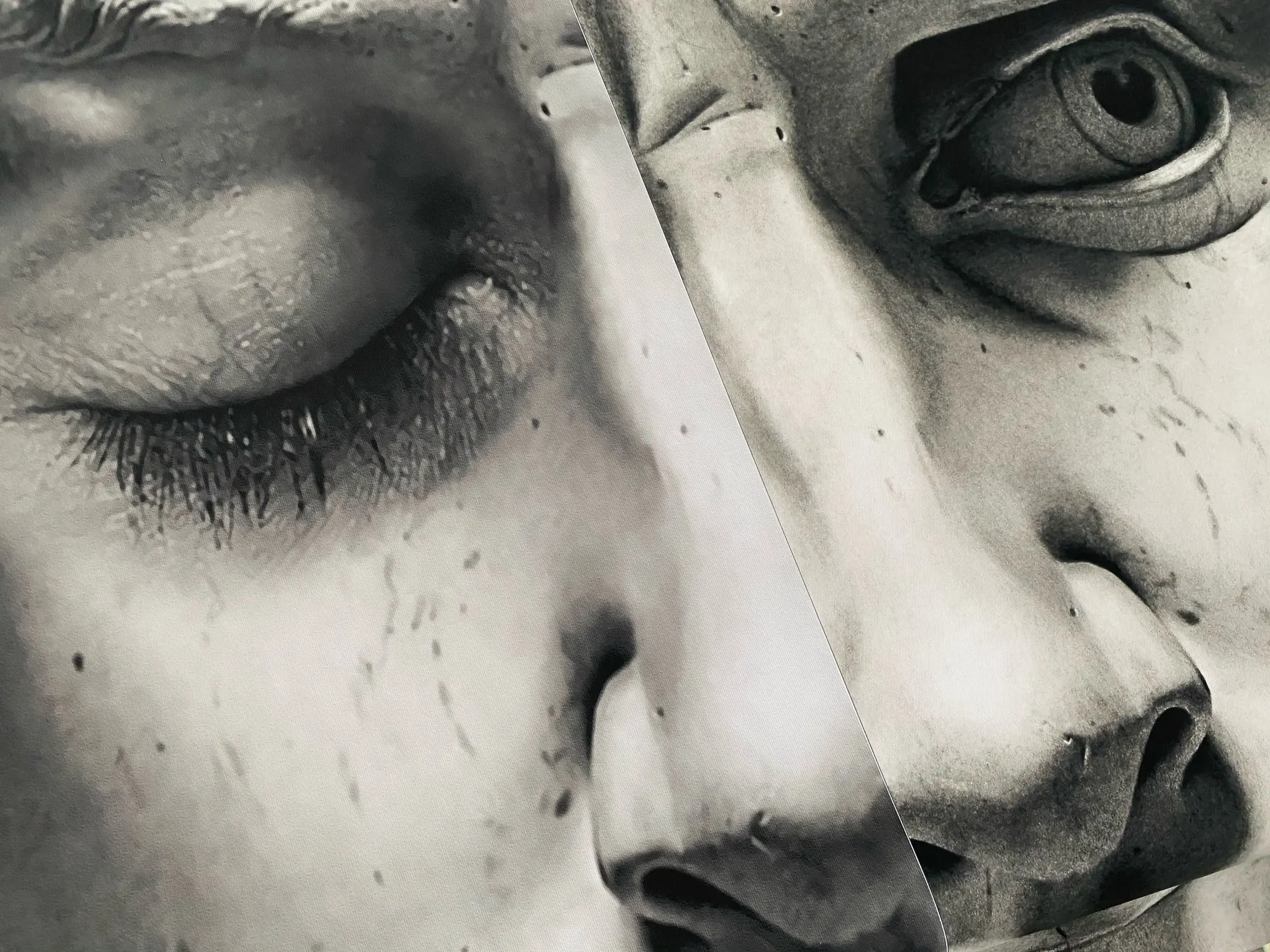 Тот, что с закрытым глазом, немного размыт, а оттенки не одинаковы