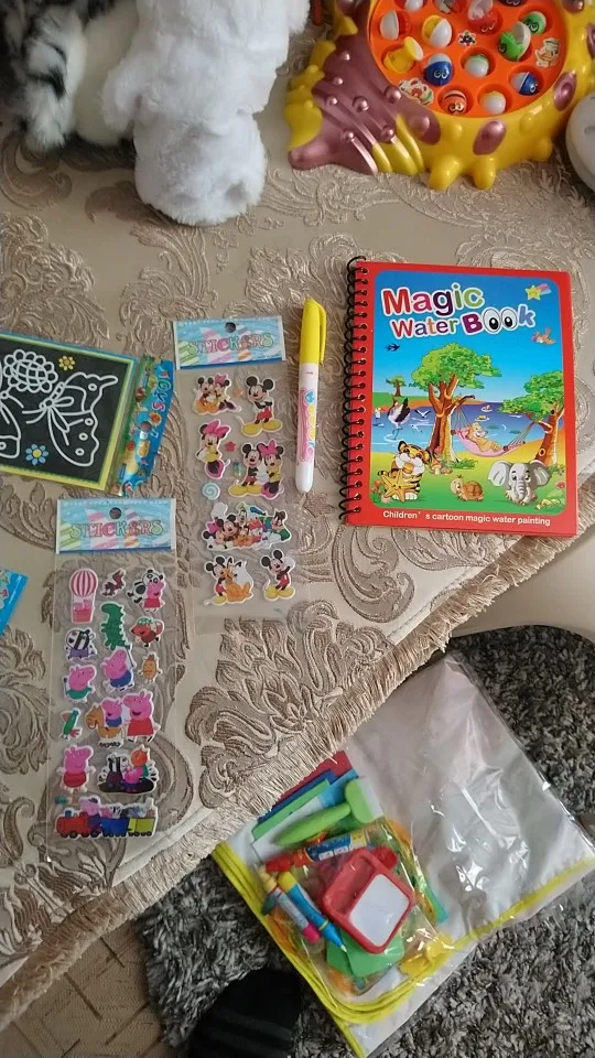 Замечательное развлечение для ребёнка. Сидит рисует уже минут 20. Мамы 2-х летних детей очень нуждаются в 20 минутах покоя :) ручка в которую надо наливать воду у нас открывается очень туго, пришлось использовать резиновую перчатку. В любом случае это отличное развлечение для ребёнка. Так же продавец дополнил заказ подарком в виде стикеров с мики маусом и картинкой - раскраской/гравюрой