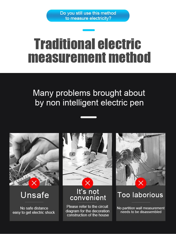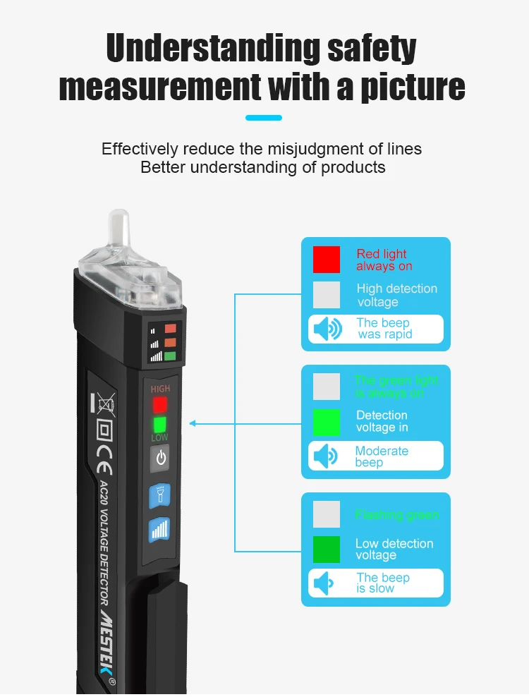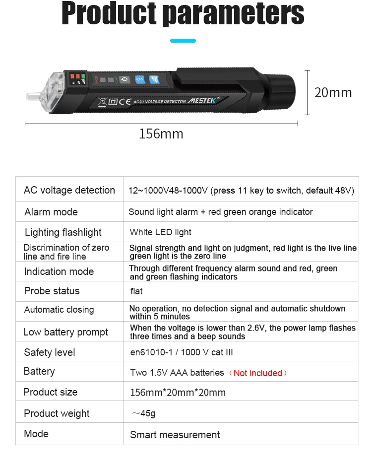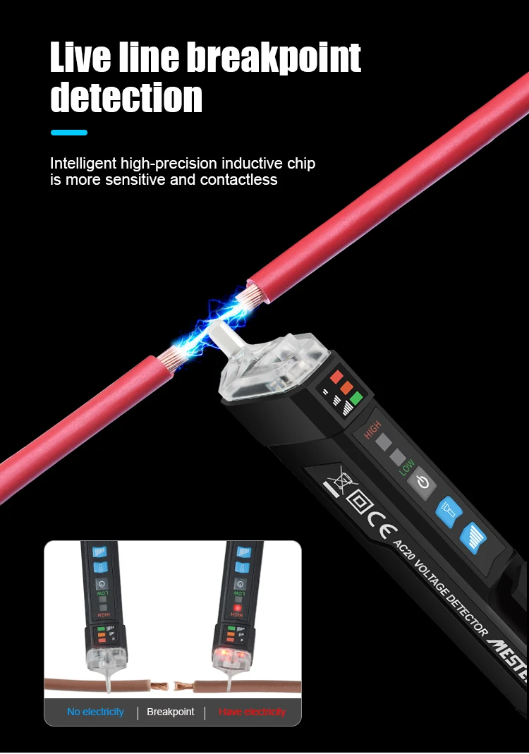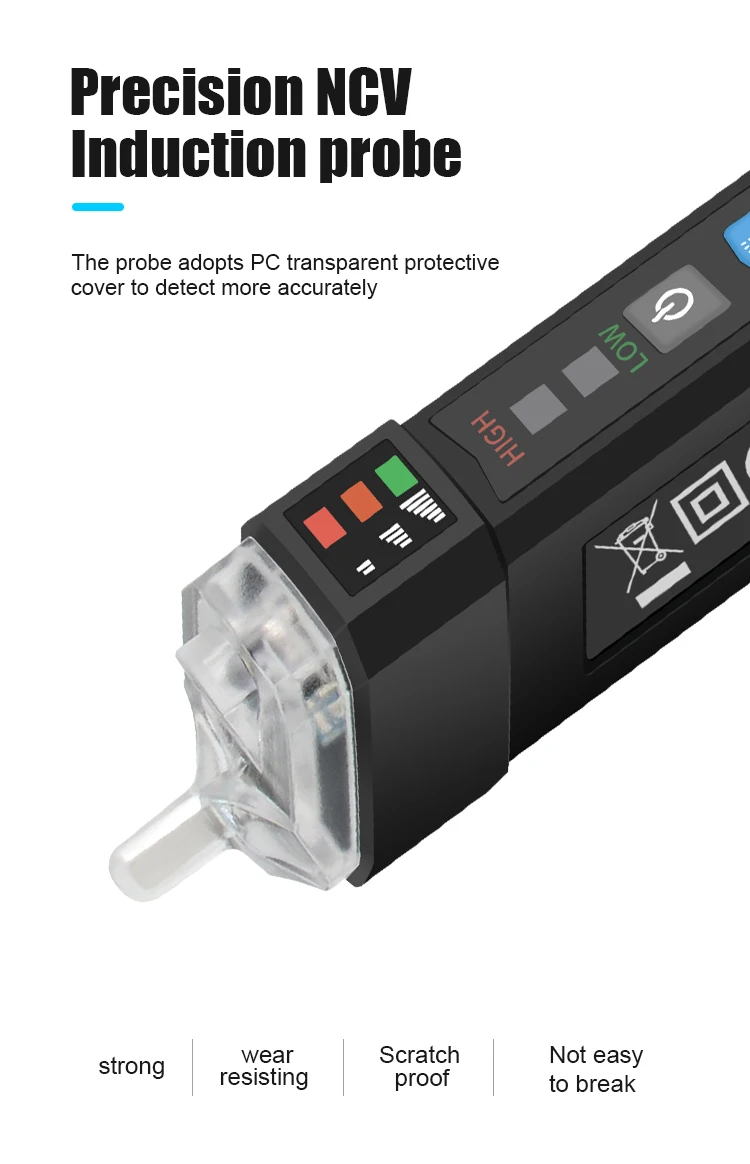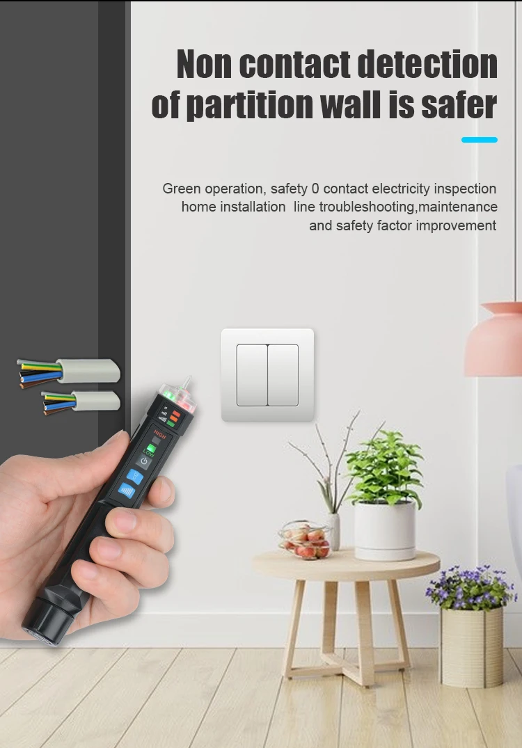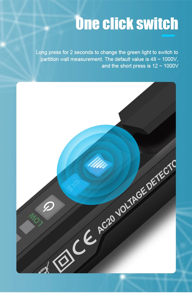 Тестер напряжения имеет бесконтактную конструкцию и форму ручки, он может определять напряжение переменного тока в 12 В ~ 1000 В или 48 В ~ 1000 В