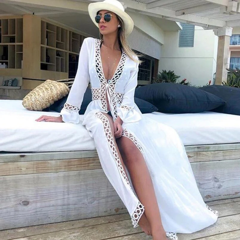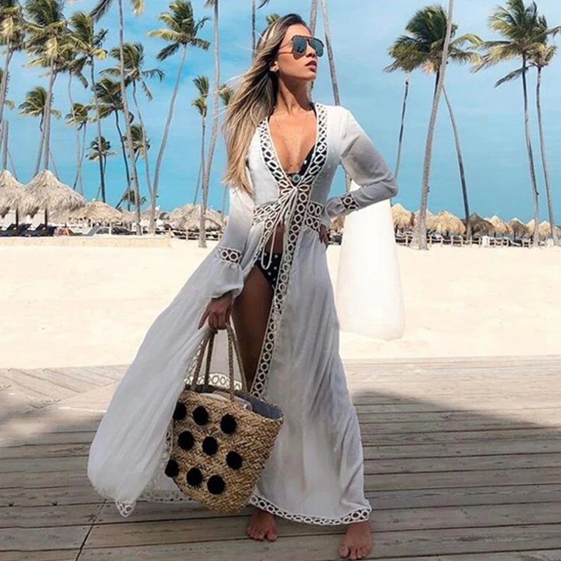 Сексуальный белый пляжный купальный костюм 2021 длинное пляжное платье туника купальник женское парео бикини накидка купальный костюм пляжный Халат