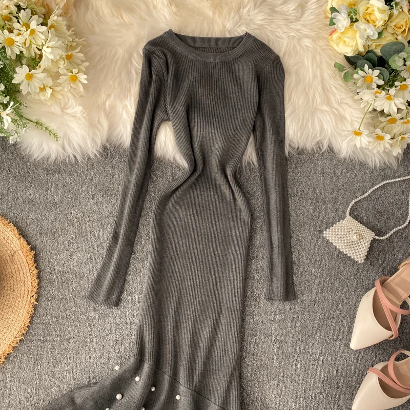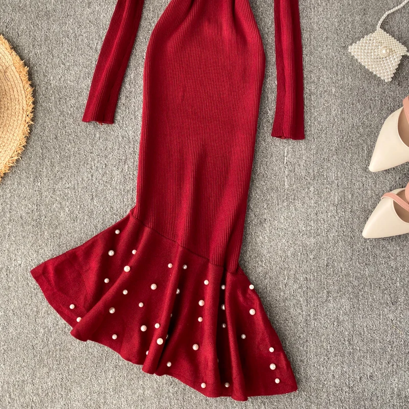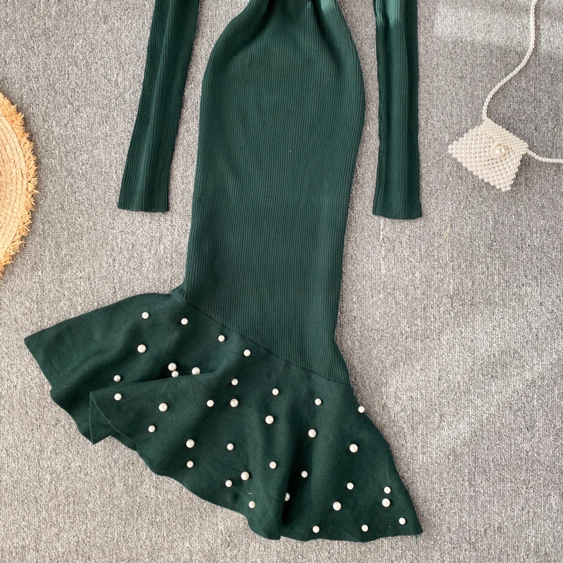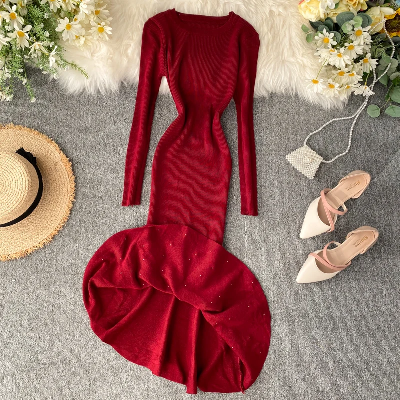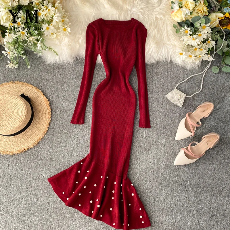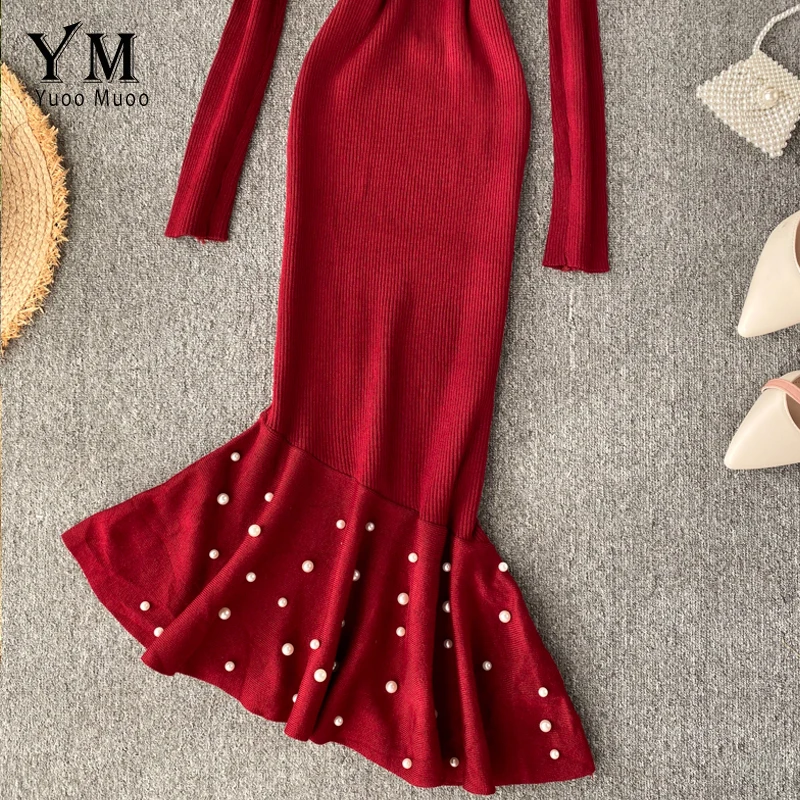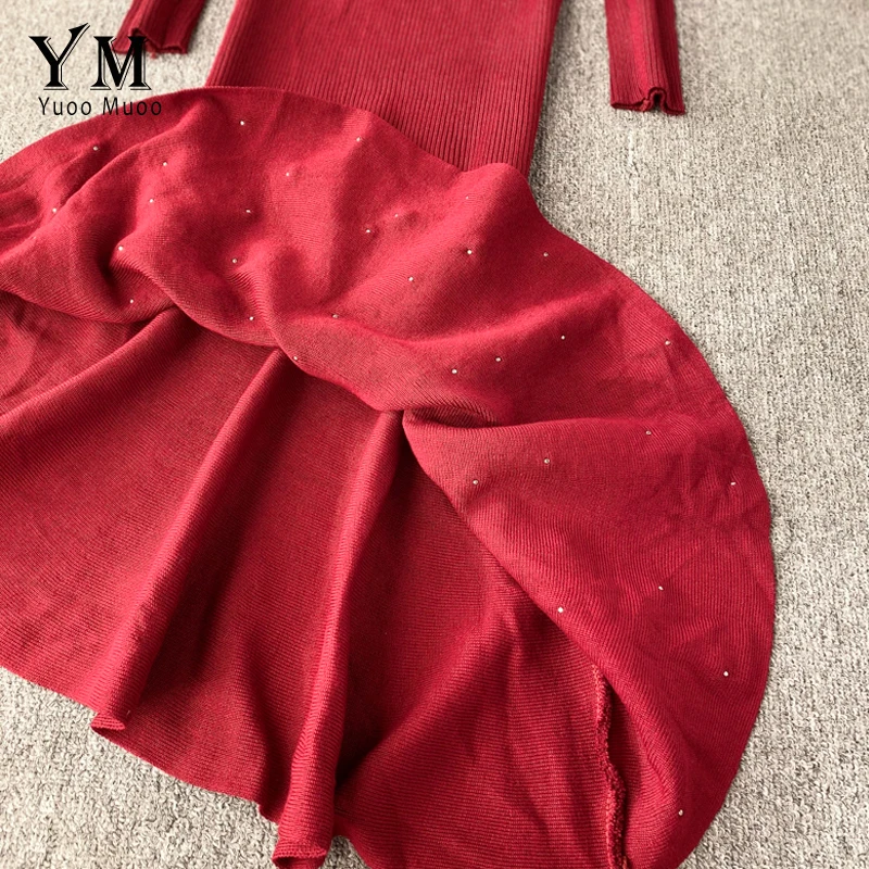 Женское трикотажное платье YuooMuoo, с асимметричным бисером и рюшами, осень платье миди Русалка, элегантное, вечернее платье с длинным рукавом