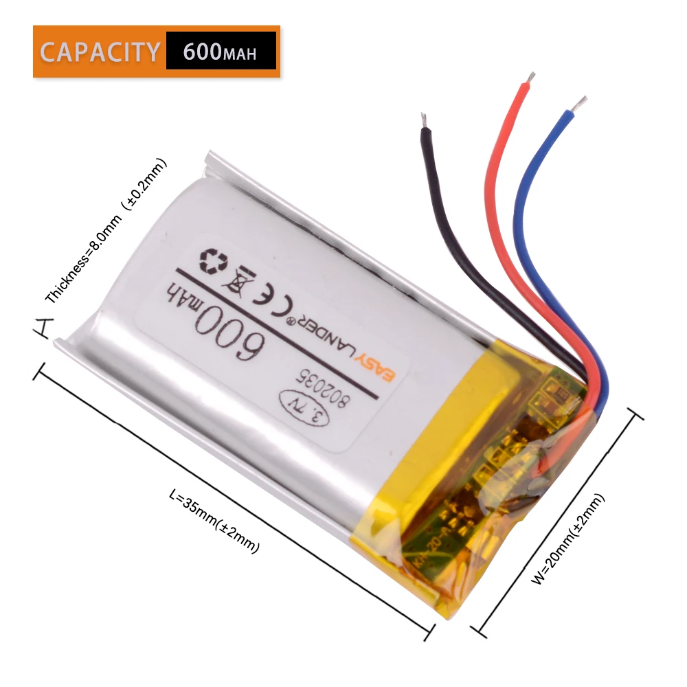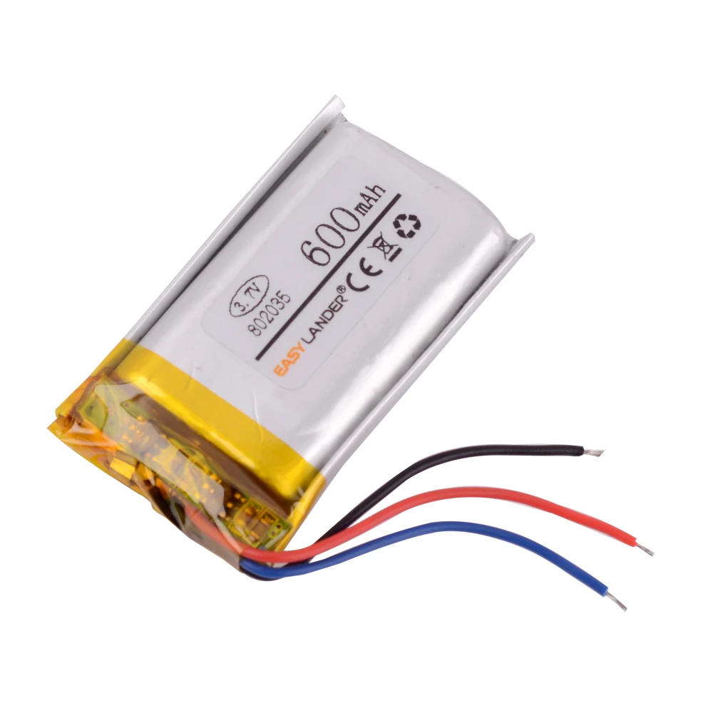 3 провода полимерный аккумулятор 802035 3,7 V 600MAH умный дом MP3 колонки литий-ионный аккумулятор для DVR,GPS,MP3,MP4, сотового телефона, динамика 082035