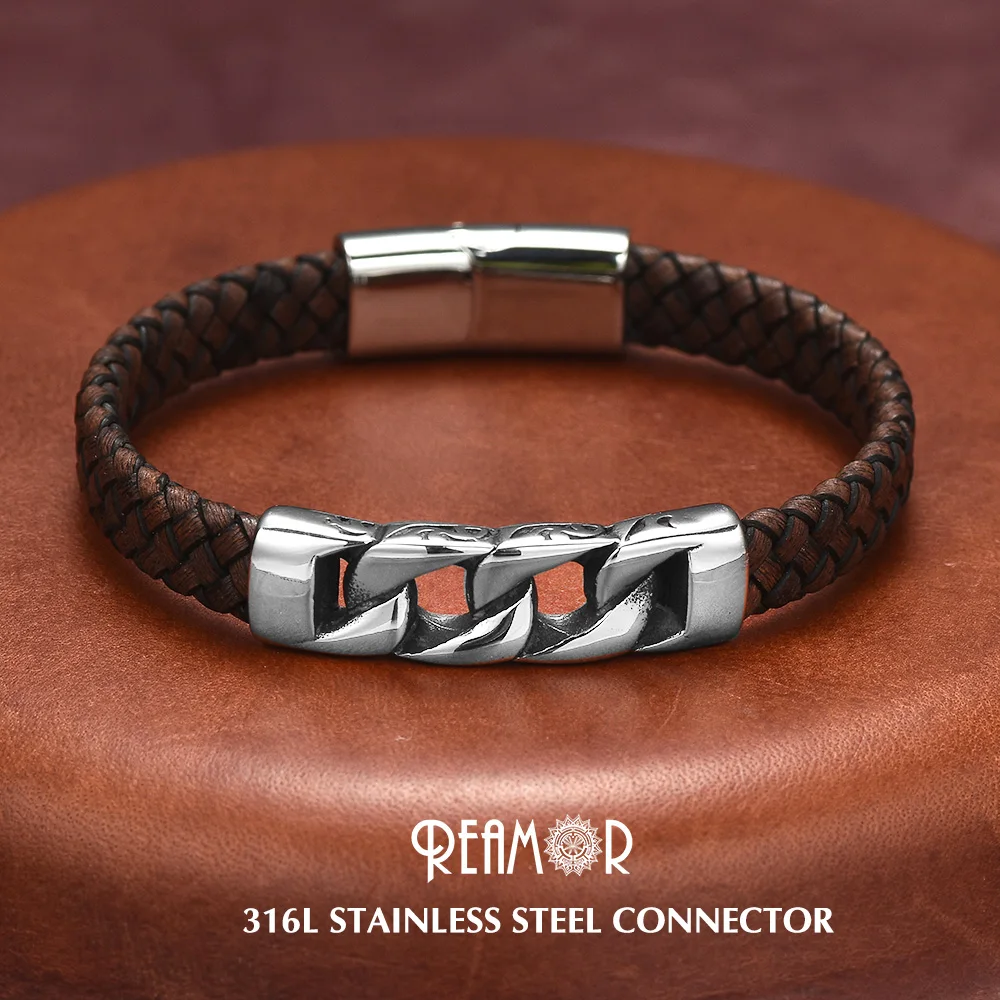 REAMOR, модные мужские ювелирные изделия, соединитель из нержавеющей стали, плетеный кожаный магнитный браслет с пряжкой, панк, мужской браслет, Pulsera Hombre