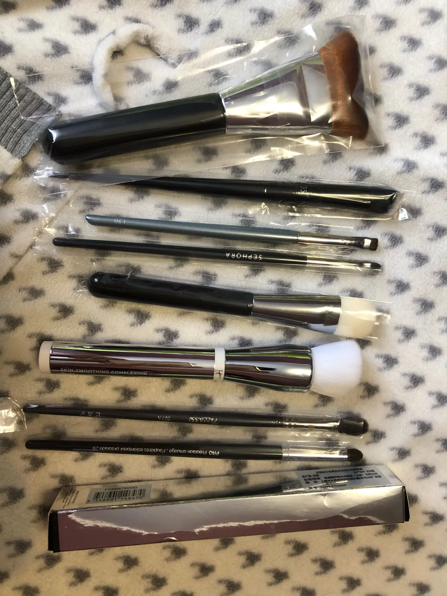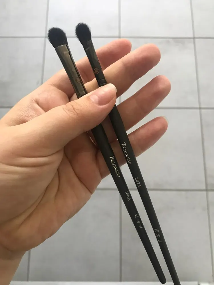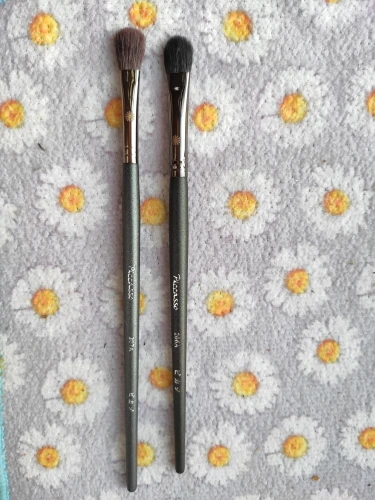Кисть натуральная. Маленькая и плоская, похожа на мою кисть доя нанесения теней, но более блестящая и скользкая, в отличие от белого ворса козы. Из-за этого более легкое нанесение. При доставке помялась, потому что ворс не был защищен, кисточка была в пупырчатом пакете. Но постле мытья и сушки в брашгарде выпрямилась. Брашгарда в наборе, кстати, не было. Ручка длинная, длиннее всех моих кистей.