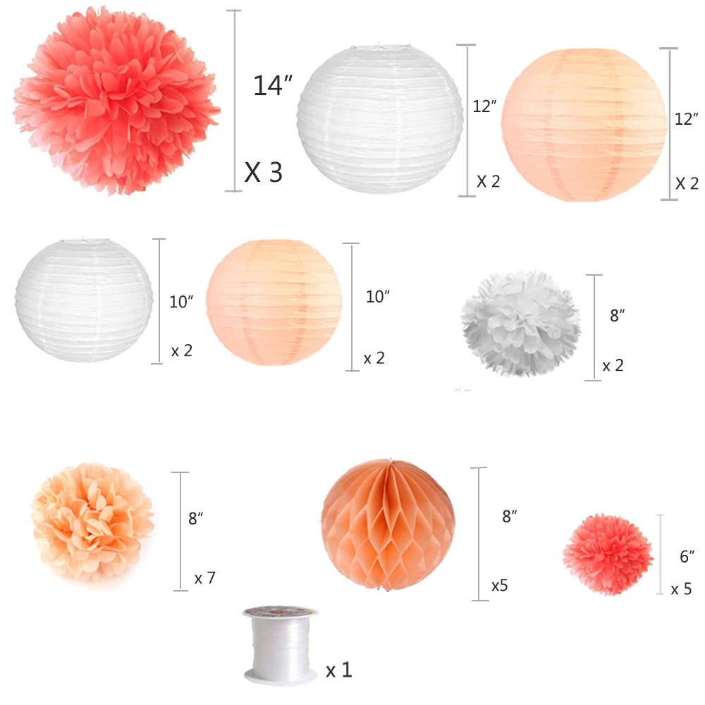 Размер и цвет-8 бумажных фонарей: 4 * белый (2*10 дюймов + 2*12 дюймов),4 * персиковый (2*10 дюймов + 2*12 дюймов): И 17 шт. папиросной бумаги цветок помпоны 2 * белый (2*8 дюймов); 7 * персиковый (7*8 дюймов); 8 * кораллов (5*6 дюймов + 3*14 дюймов); И 5 шариков в форме бусин (8 дюймов)