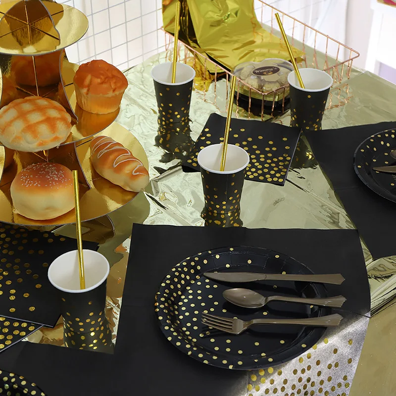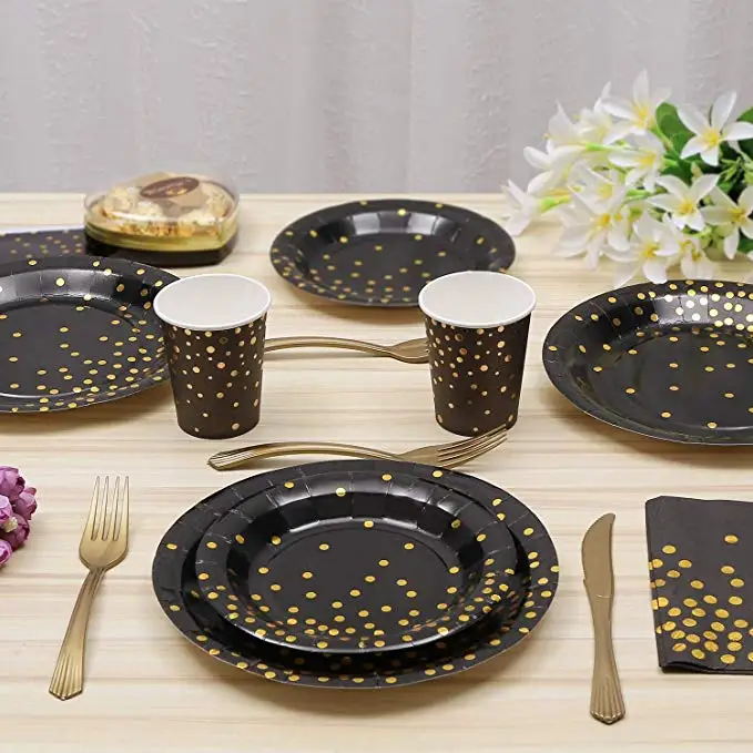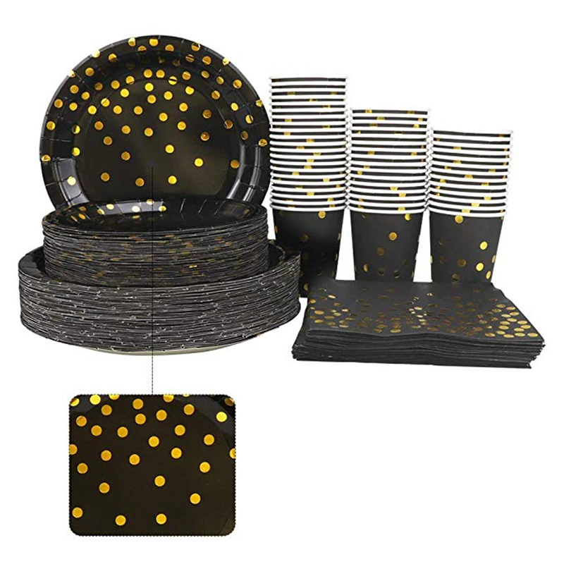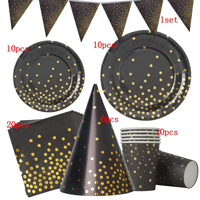 Черный золотой фольги бумаги для взрослых день рождения партии одноразовые бумажные стаканчики для украшения взрослых одноразовые бумажные тарелки набор юбилейный Декор