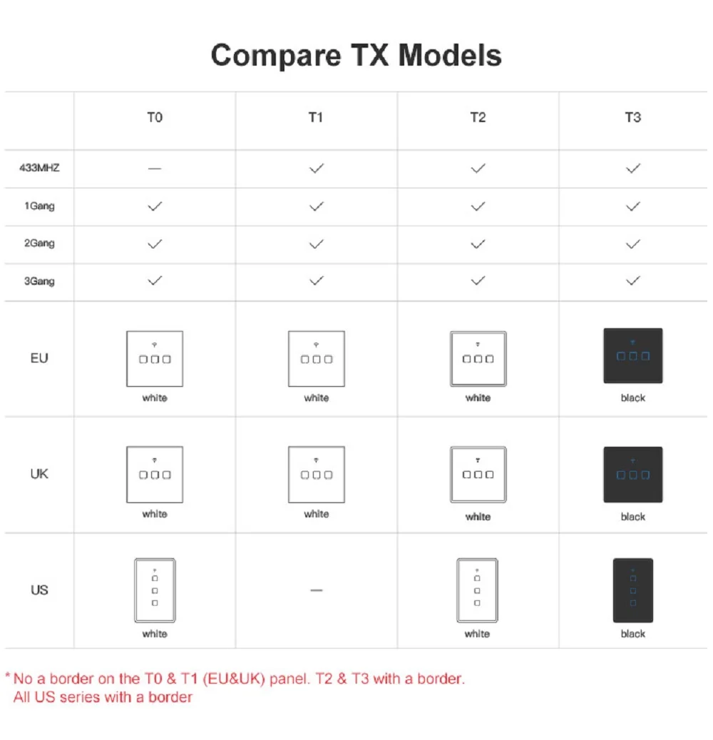 Примечание: T1 должен питаться от прямых и нейтральных проводов. В некоторых домах нет нейтрального провода на настенном выключателе. Спецификация продукта: Источник питания: 90 ~ 250 В переменного тока Номинальная частота: 50 Гц/60 Гц Макс. Ток: 2A/250 В/gang Макс. Мощность: 600 Вт/комплект Банды: 1/2/3 банды Размеры: 86 мм * 86 мм (стандарт ЕС/Великобритании/США) Методы управления: сенсорный/App eWeLink/RF Remote Беспроводной Стандартный: Wi-Fi 2,4 ГГц и 433 МГц RF (по ТИХООКЕАНСКОМУ летнему времени США: 315 МГц)(T2 свяжитесь с нами: 433 МГц) Материал: ABS V0 + панель из закаленного стекла Механизм безопасности: WEP/WPA-PSK/WPA2-PSK Преимущества продукта: Дистанционное включение/выключение-включение/выключение света из любого места Поддержка приложений-Бесплатное мобильное приложение для iOS и Android eWeLink Радиочастотный пульт дистанционного управления-включение/выключение на 433 мгц радиочастотный пульт дистанционного управления в помещении Независимое управление-контроль каждой банды отдельно Подходит для старой коробки-плавно заменяет ваш старый 86 Тип настенный светильник Статус синхронизации-Статус устройства в режиме реального времени предоставляется приложению Время-установить расписание/таймер обратного отсчета для включения/выключения в указанное время Управляйте своим умным домом вместе с семьей Сцена-включение/выключение устройства одним нажатием Умная сцена-срабатывает вкл/выкл при температуре, влажности или других условиях окружающей среды Голосовое управление-прекрасно работает с Amazon Alexa, Google Home