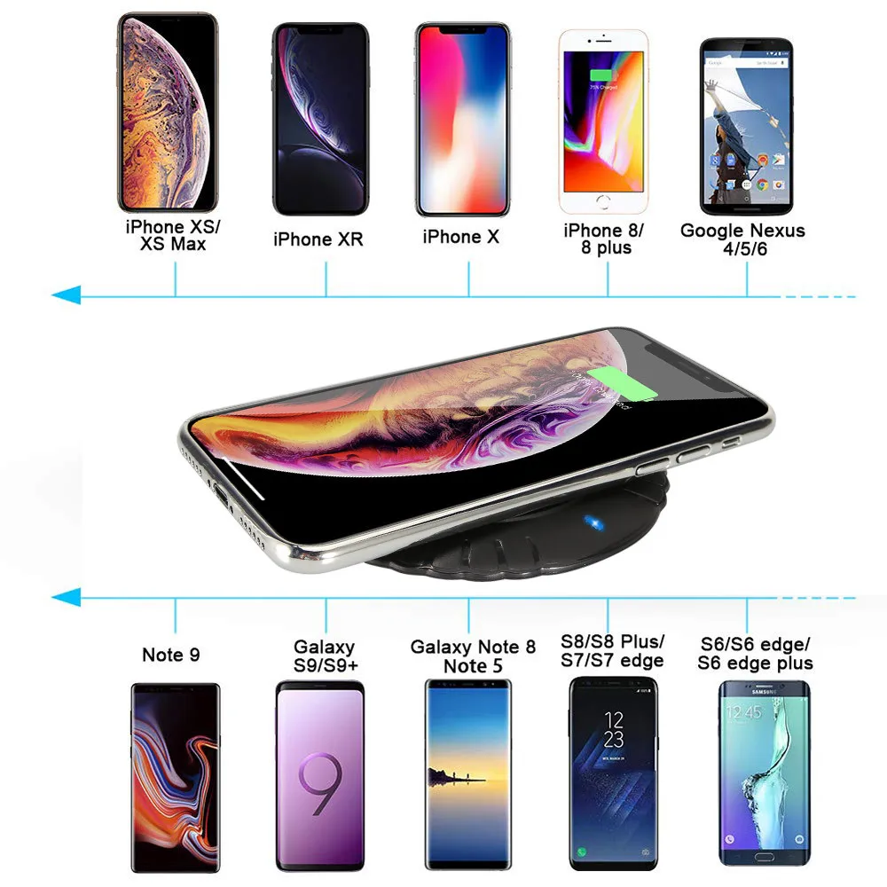 Только эти мобильный телефон моделей напрямую поддерживают беспроводную зарядку, а для других мобильный телефон моделей требуется карта приема беспроводного зарядного устройства. Для Samsung Galaxy s6 / s6 edge / s6 edge plus / s7 / s7 edge / s7 edge plus / s8 / s8 plus / s9 / s9 plus / s10 / note 5 / note 8 / note 9 Для iPhone 8 / iPhone 8 plus / iPhone X / iPhone Xs Max / iPhone XR Для Lumia 1520/1020/920/822/820/93 Для HTC 8X / HTC Butterfly / HTC amazing 4GLTE Для Motorola 360 Для LG Nexus4 / 5/6 / LG LTE2 / LG D1 Эти модели телефонов не поддерживают беспроводные зарядные устройства Например: Для iPhone 5 5s se iPhone 6 6s Plus iPhone 7 7Plus Подходит для Xiaomi Huawei Redmi Oppo Vivo Meizu HTC Oneplus Nokia Особенности Поможет телефону поддерживать беспроводную зарядку
