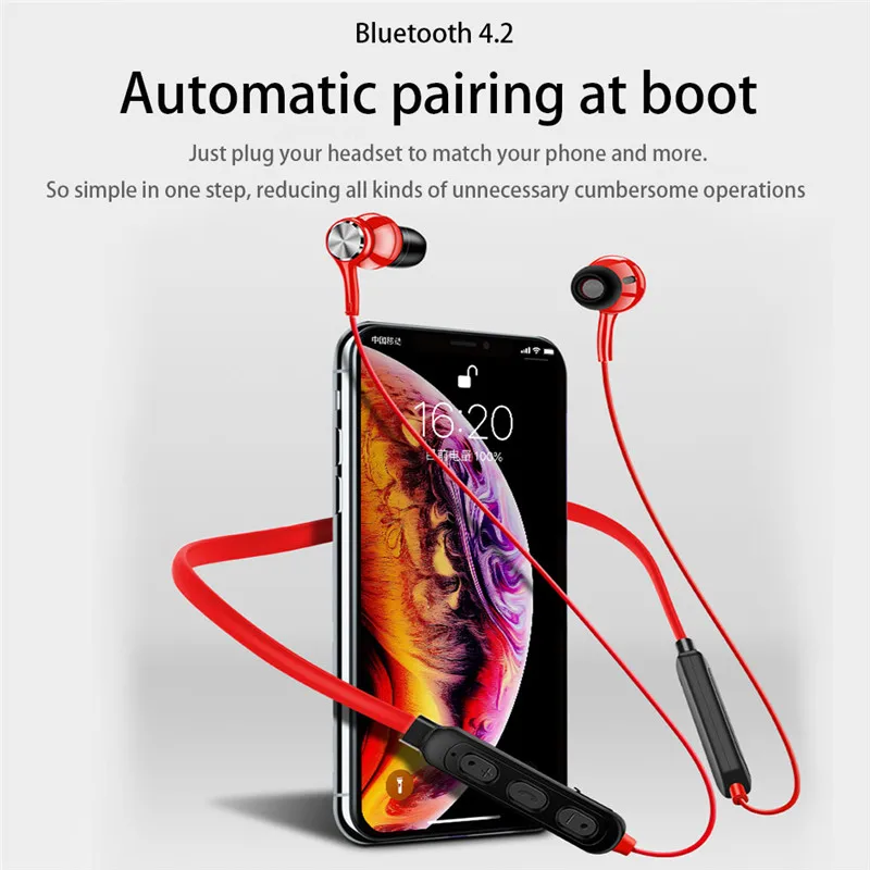 Особенности: * Беспроводная BT 4,2 обеспечивает передачу сильного сигнала высокого качества и высокой скорости, обеспечивая высокую точность стерео музыки. * С функцией магнитного всасывания, и когда вы не используете наушники, вы можете носить наушники на шее, чтобы избежать его падения. * Встроенный микрофон позволяет совершать звонки без рук, чтобы освободить руки при занятиях спортом. Он также поддерживает технологию многоточечного соединения. * С кнопками линейного управления, легко управлять воспроизведением/паузой, регулировать громкость, предыдущие/последующие песни, отвечать/отклонять/заканчивать вызовы. * Эргономичный дизайн гарантирует стабильное и удобное ношение во время занятий спортом, бега, скалолазания и других видов спорта на открытом воздухе.
