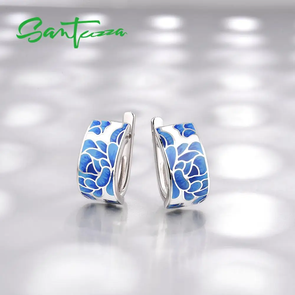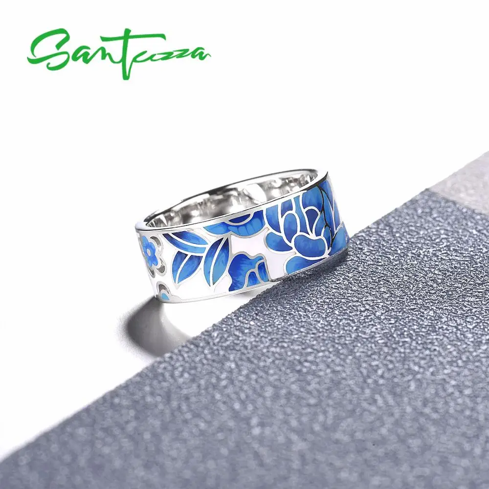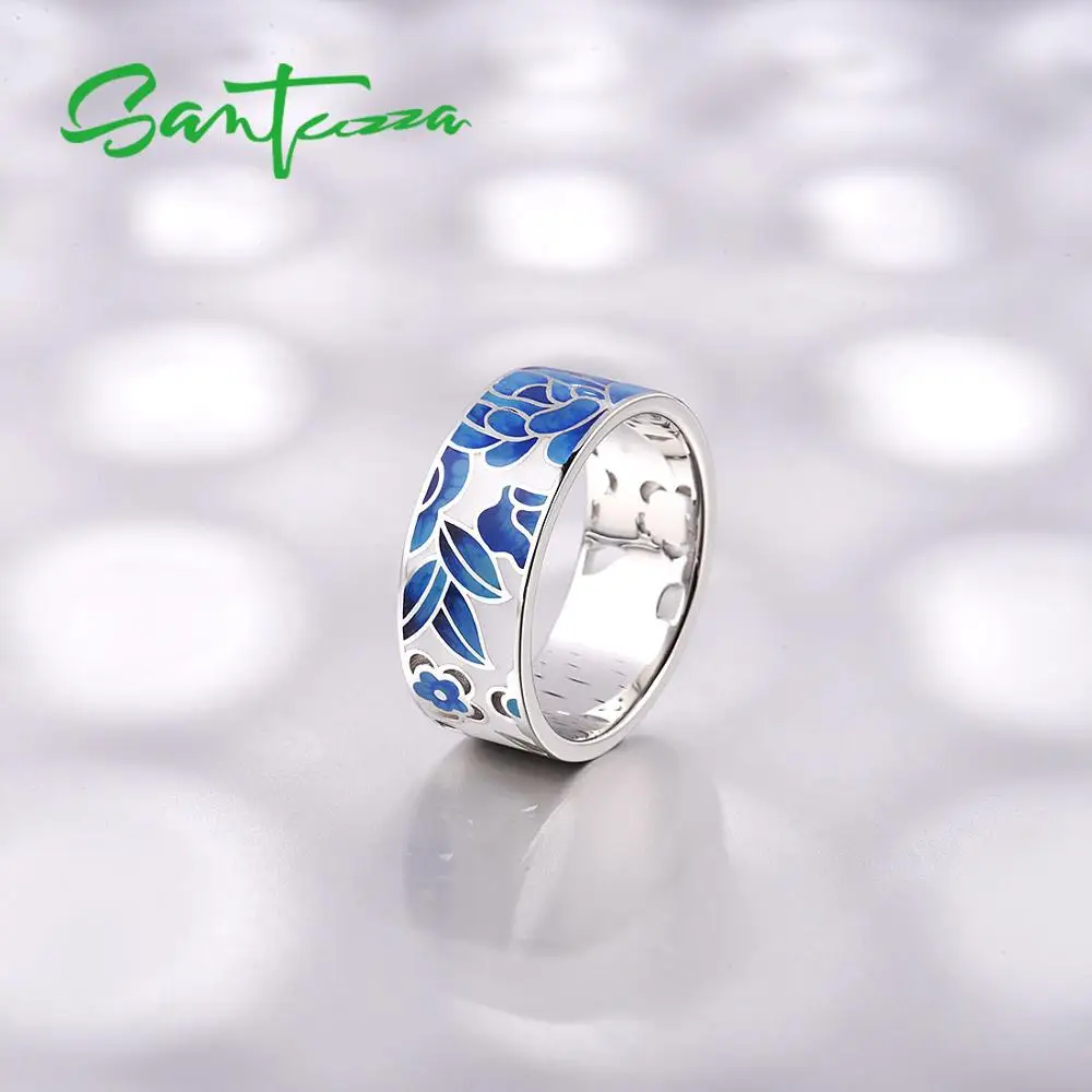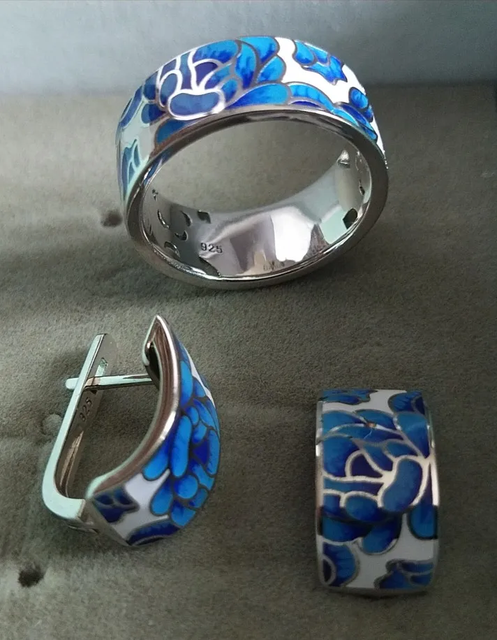 Комплект из серебра набор украшений для женщин пробы, кольца и сережек SANTUZZA, с эмалированным синим цветком, ручная работа