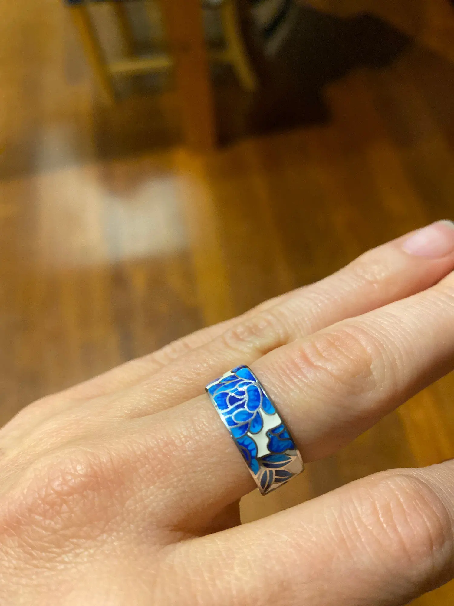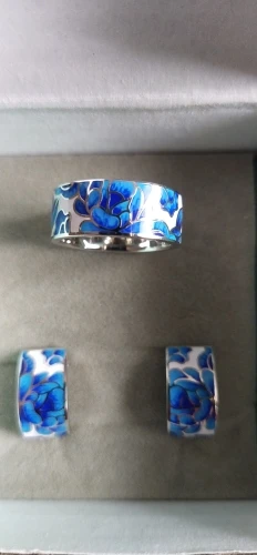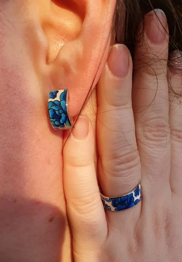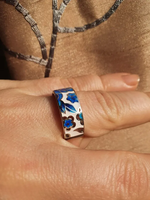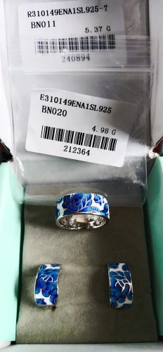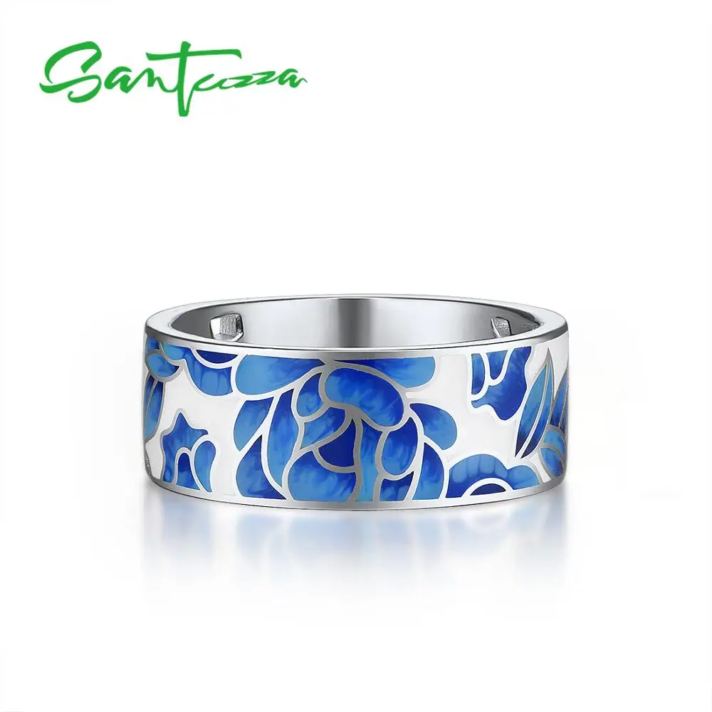 Комплект из серебра набор украшений для женщин пробы, кольца и сережек SANTUZZA, с эмалированным синим цветком, ручная работа
