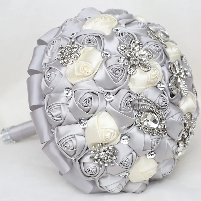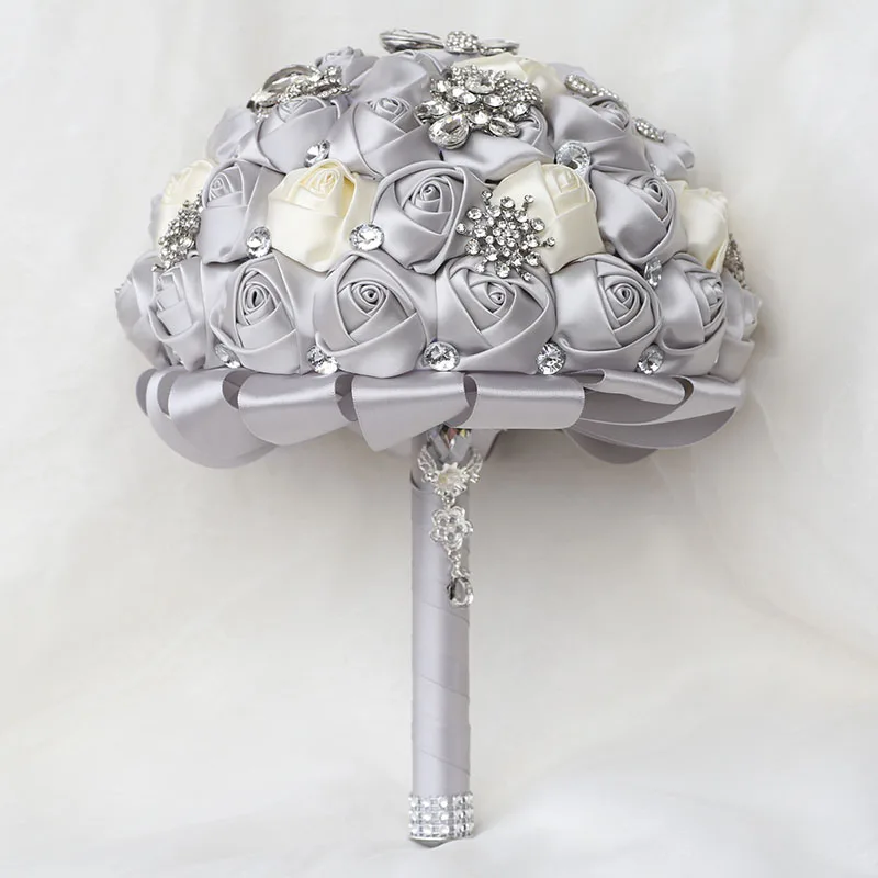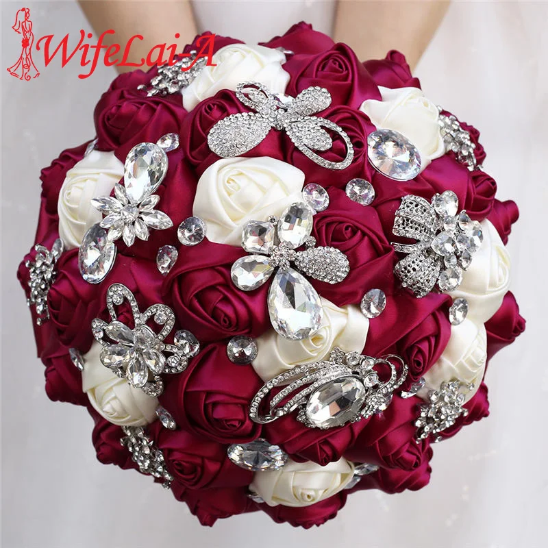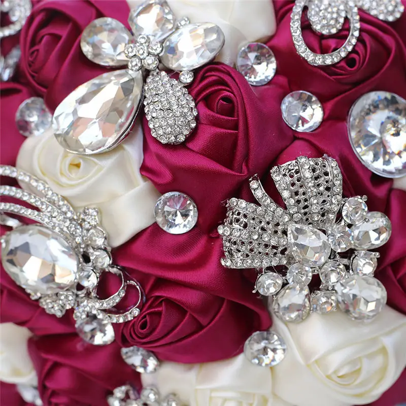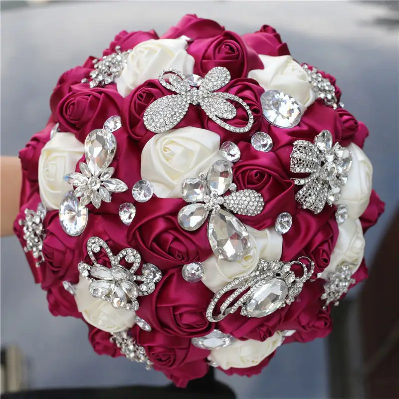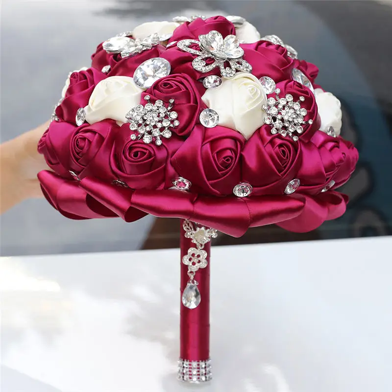 Свадебный букет из фиолетовых атласных роз под соус, свадебная брошь цвета слоновой кости, свадебные стразы, букеты для подружки невесты, W704