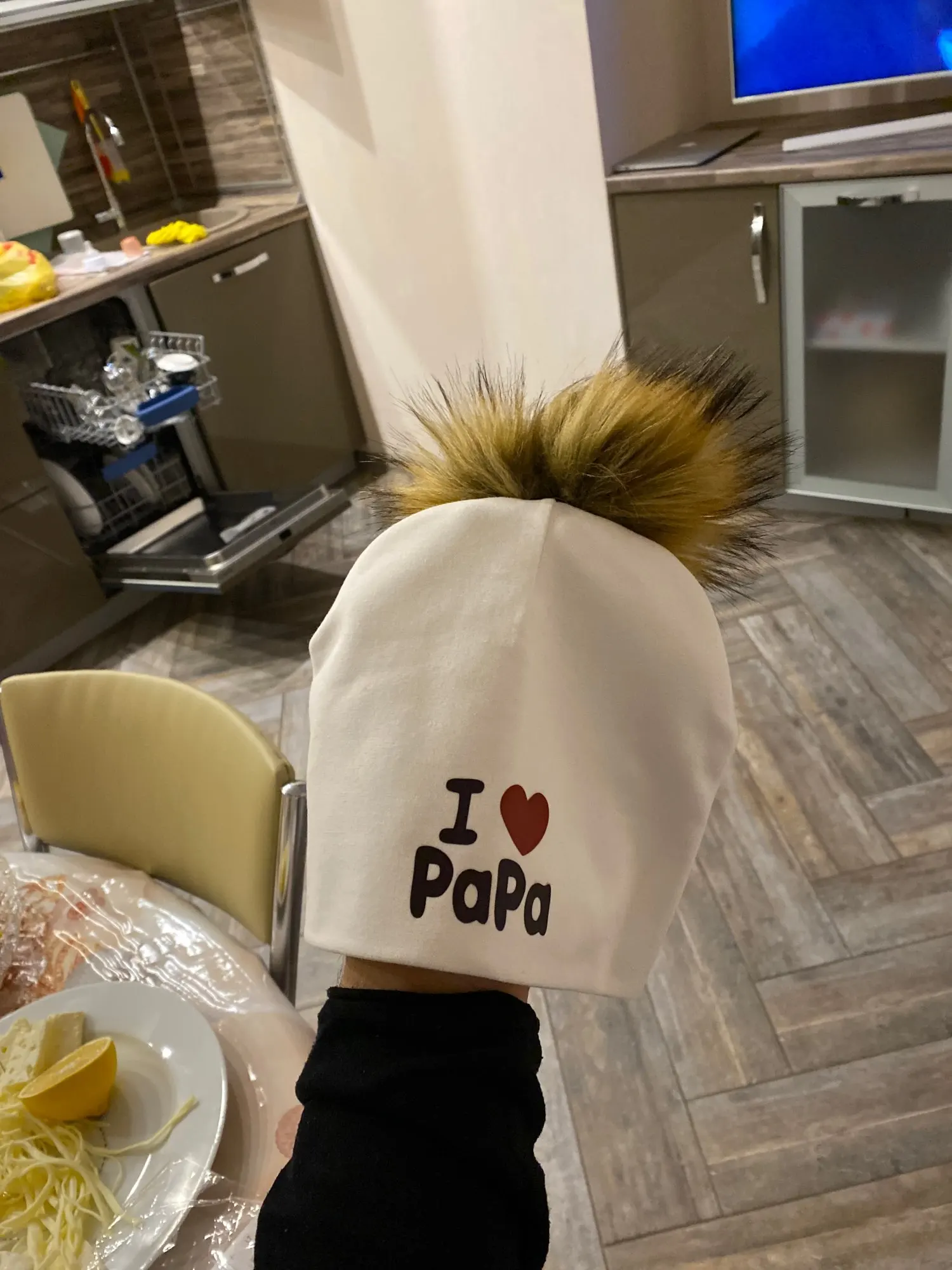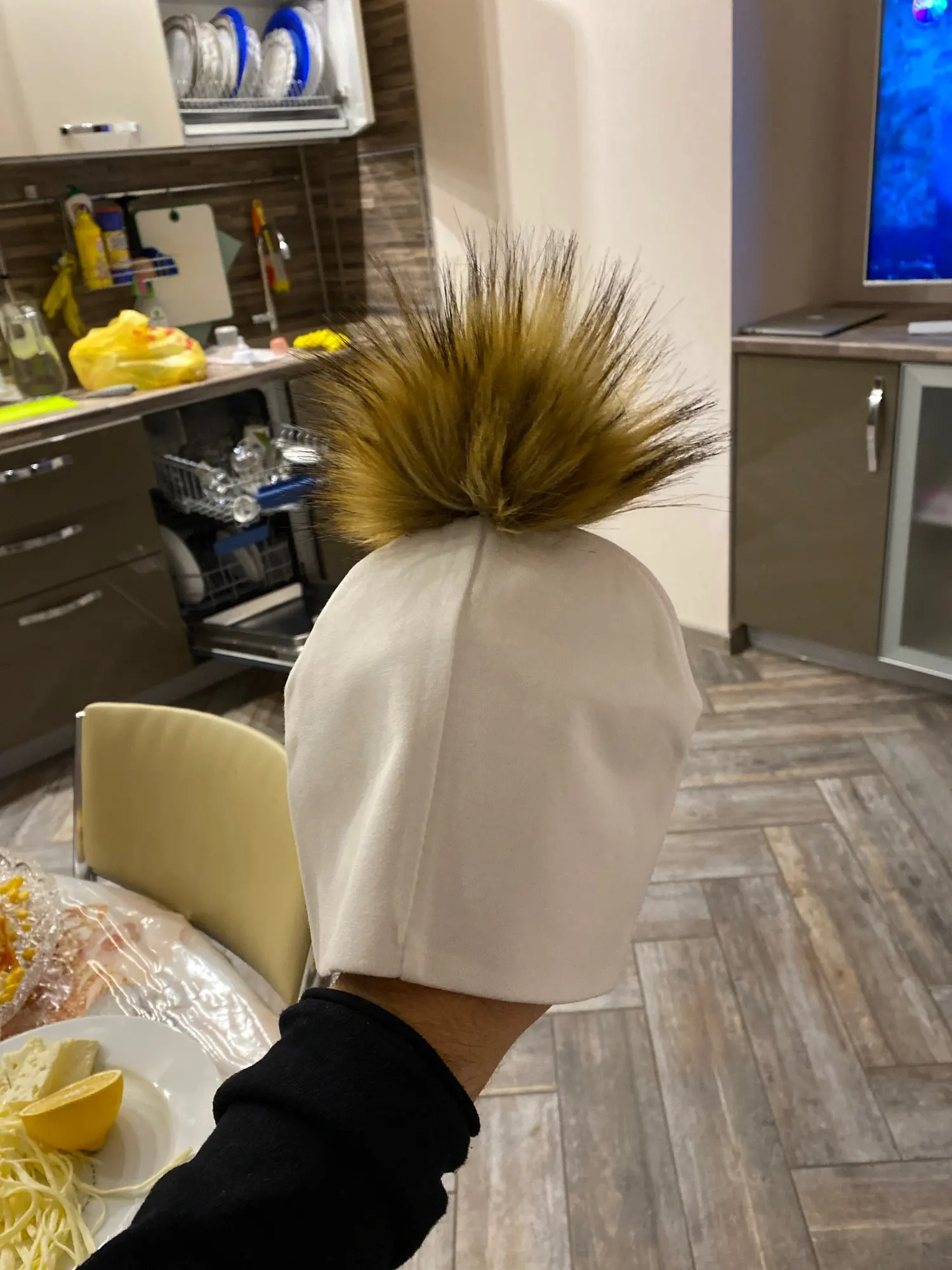 пришла огромная на мою голову залезет,помпон леняет но не сильно ,не такой пушистый как на фото,но в целом за свою цену нормально)