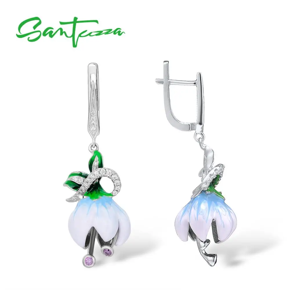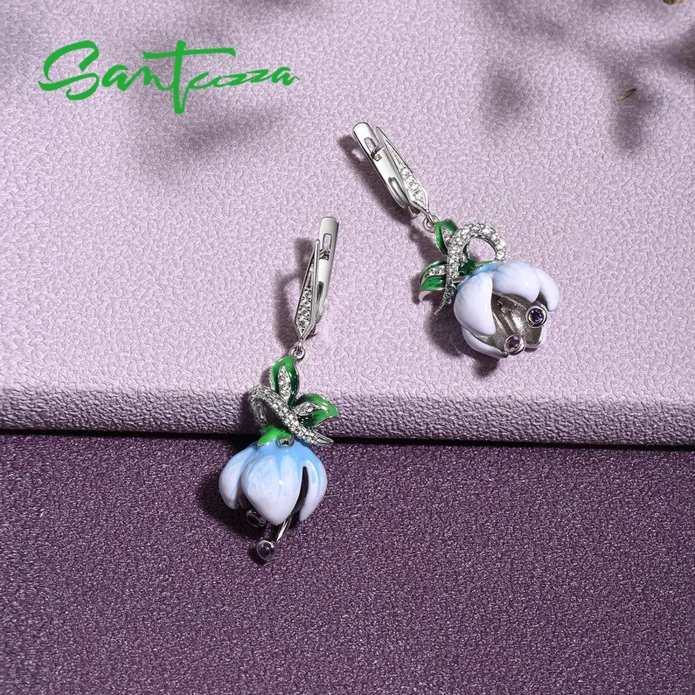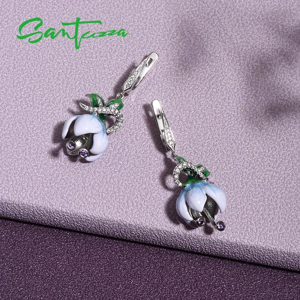 Женские серебряные серьги SANTUZZA, из серебра 925 пробы с белыми цветущими цветами, эмалевые ювелирные украшения ручной работы