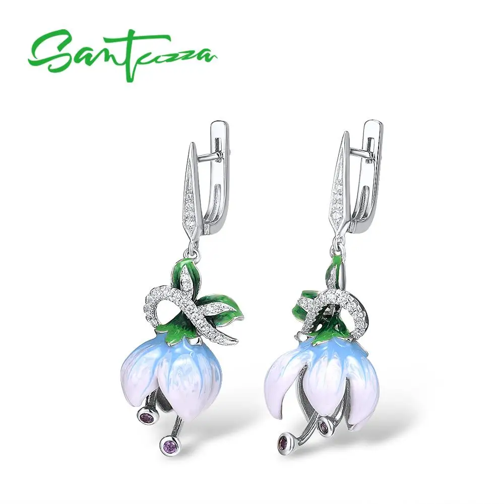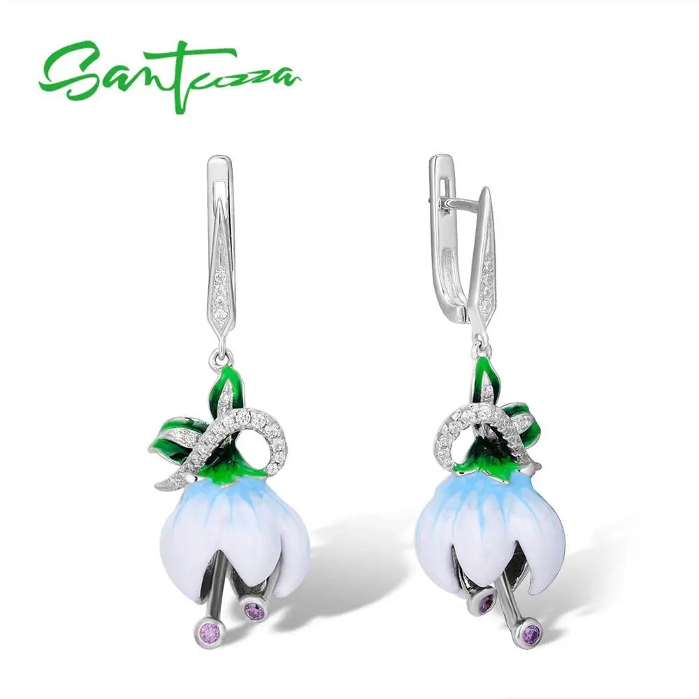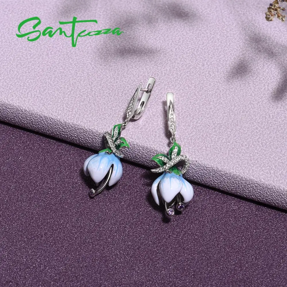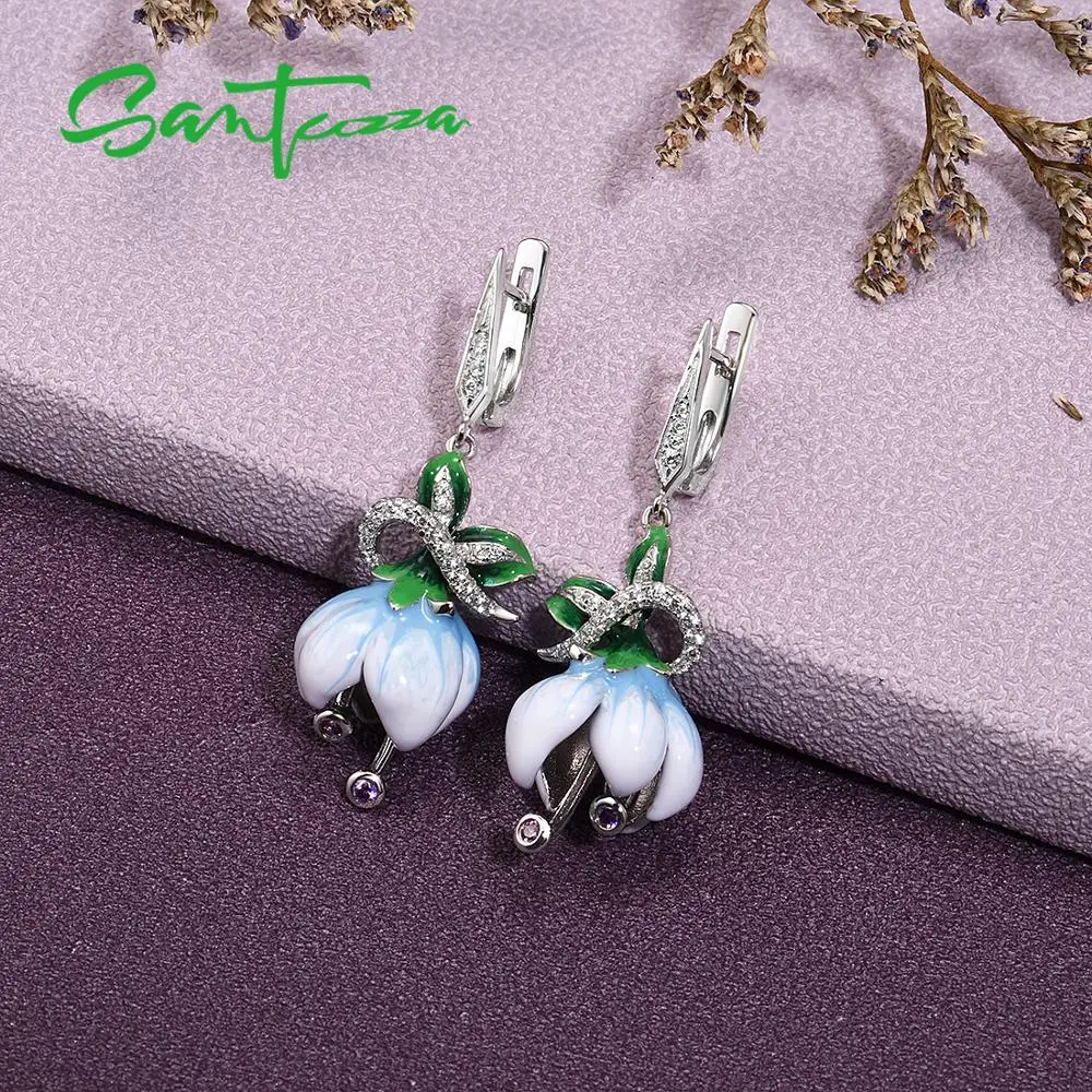 Женские серебряные серьги SANTUZZA, из серебра 925 пробы с белыми цветущими цветами, эмалевые ювелирные украшения ручной работы
