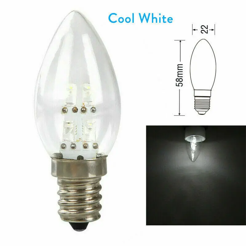 Светильник источник света: светодиод высокой мощности Светодиодный чипы Оттенок Материал: Стекло Лампа Мощность: 1 Вт (≈ 10W лампа накаливания) Основание Тип: E12 Светодиодный Кол-во: 4 шт. Светильник Цвет: теплый белый/холодный белый/синий Входное напряжение: 220 В переменного тока/110 В Световой поток: 80LM Угол луча: 360 ° Рабочая температура: -20 ℃ ~ + 40 ℃ (Чип на плате) Срок службы: 30000hrs Размер (Ш * В): 22*28 мм Вес: 9 г