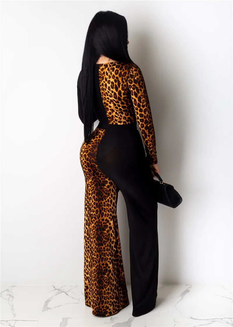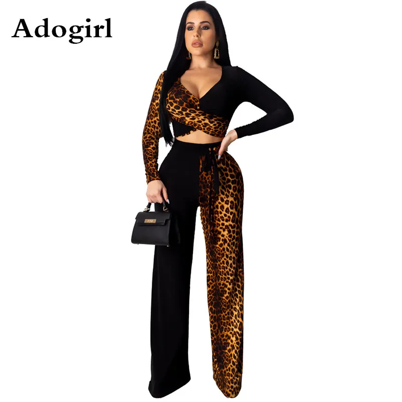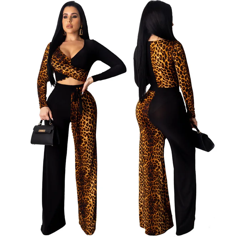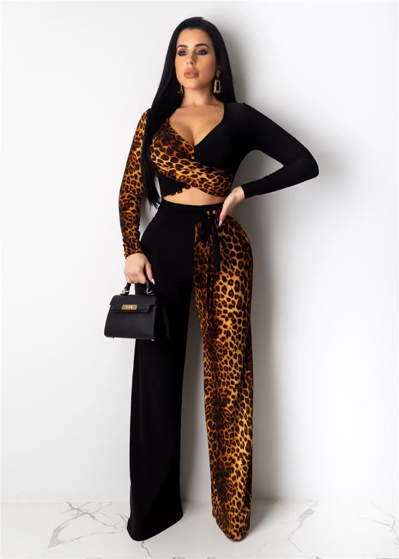 Леопардовый принт пэтчворк сексуальный комплект из двух предметов с длинным рукавом и v-образным вырезом топ + широкие штаны костюм для ночного клуба вечерние костюмы для ночного клуба