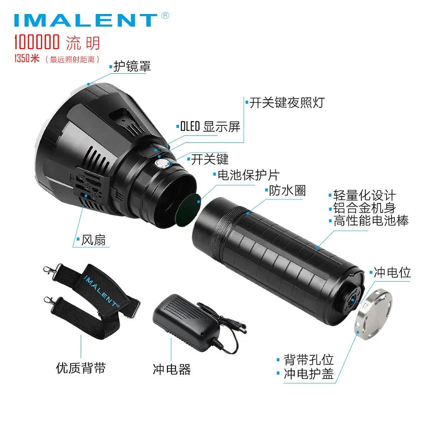 Название продукта: Imalent MS18 светодиодный фонарик Бренд: Imalent Модель: MS18 Тип эмиттера: 18x XHP70 Pe.ak луч Inten.sity: 458000cd Цвет температуры: 5000k Максимальная выходная мощность: 100000 люменов Диапазоны: 1350 метров Режим: TURBO/высокая Ⅲ/высокая Ⅱ/высокая Ⅰ/средний Ⅱ / MiddleⅠ/средний низкий/Низкий Люмены: Турбо: 100000-25000lm Высокая Ⅲ: 60000-25000lm Высокая Ⅱ: 30000-25000lm Высокая Ⅰ: 22000lm Средний Ⅱ: 10000lm MiddleⅠ: 5000lm Средний низкий: 2000 лм Низкий: 700 лм Время работы: 60s + 52min, 70s + 55min, 3,8 s + 60min,67min, 3h40min, 6h50min, 9h15min, 14h52min Конфигурации батареи: 8x 20700/4300 литий-ионные аккумуляторы (встроенный) Тип переключателя: Clicky Расположение переключателя: Сторона фонарика Материал: Аэрокосмический алюминиевый сплав Ударопрочность: 1,5 м Водонепроницаемость: IP56 Отражатель: Алюминиевый отражатель SMO Ремень для переноски: Ремешок Цвет: Черный Вес: 1740 г без аккумулятора Размер: 265 мм x 129 мм x 59 мм (Длина x Диаметр головки x диаметр корпуса)Особенности: