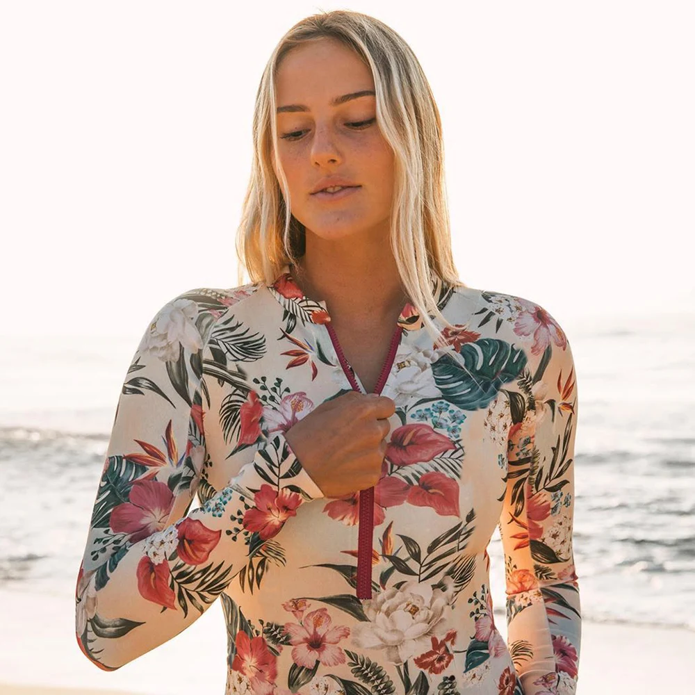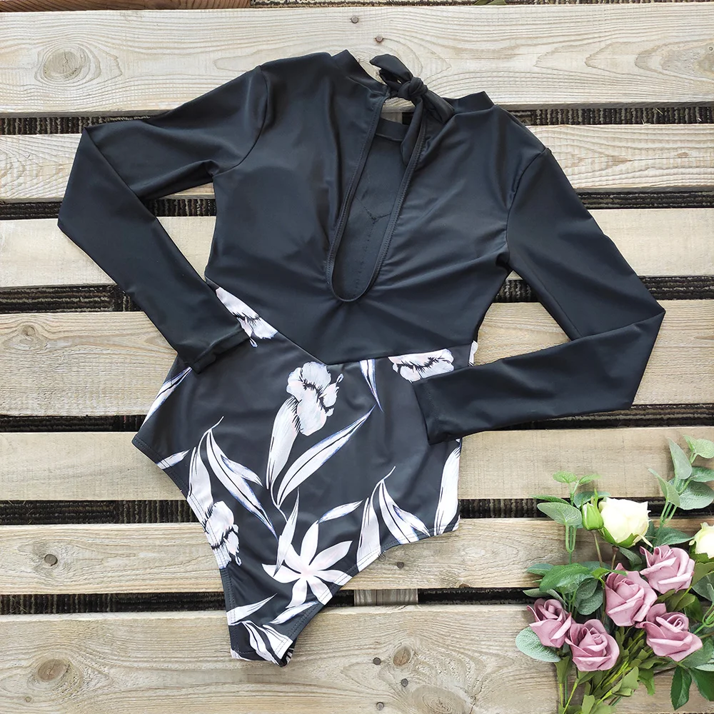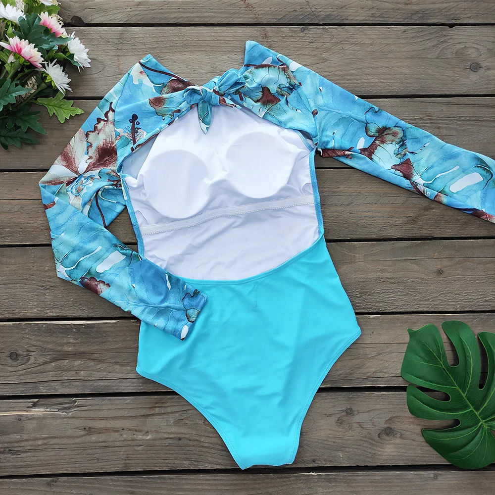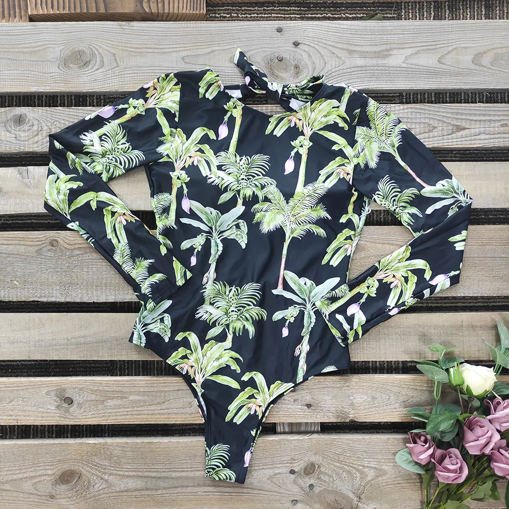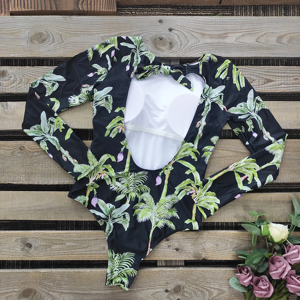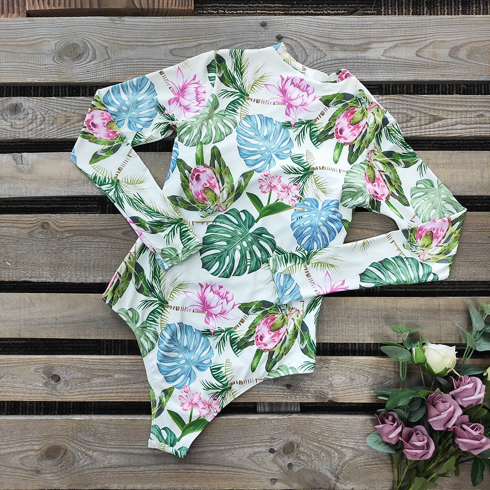 Слитный купальник с принтом листьев для серфинга, одежда для плавания с длинным рукавом, женский купальный костюм, купальный костюм в стиле ретро, винтажная пляжная одежда, купальные костюмы, 2022