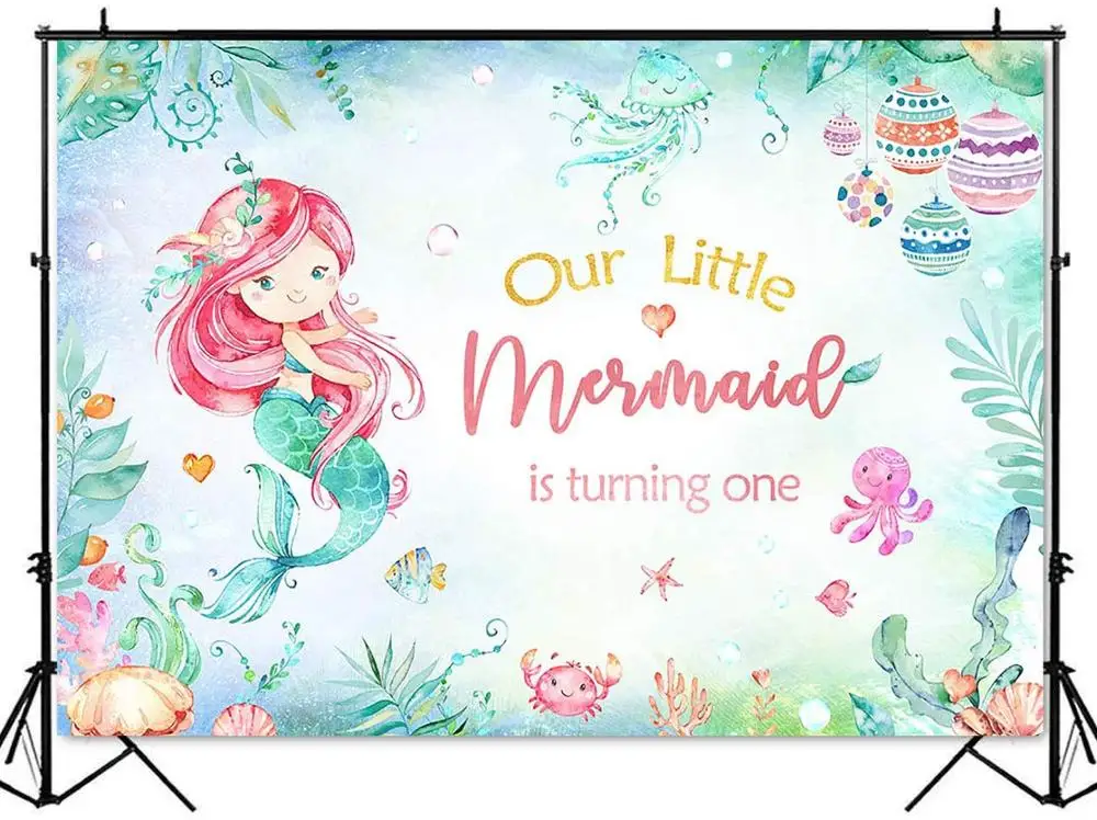 Фотофон Русалка первый день рождения акварель Русалка День Рождения фотография Фон 7x5 футов Винил под морем День рождения баннер