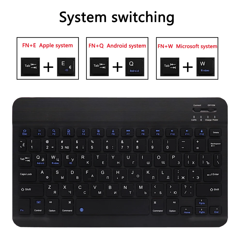 Встроенная Самая тонкая беспроводная клавиатура Bluetooth 3,0. Встроенная перезаряжаемая литиевая батарея длится около 100 часов за зарядку. EЭнергосберегающая клавиатура с режимом сна Ультра-тонкий Bluetooth клавиатура Элегантный, компактный дизайн, обеспечивающий максимальная портативность и удобство. Обеспечивает более быстрый и комфортный ввод, Улучшает точность работы. Легко снимается из искусственной кожи чехол. USB кабель для зарядки входит в комплект.