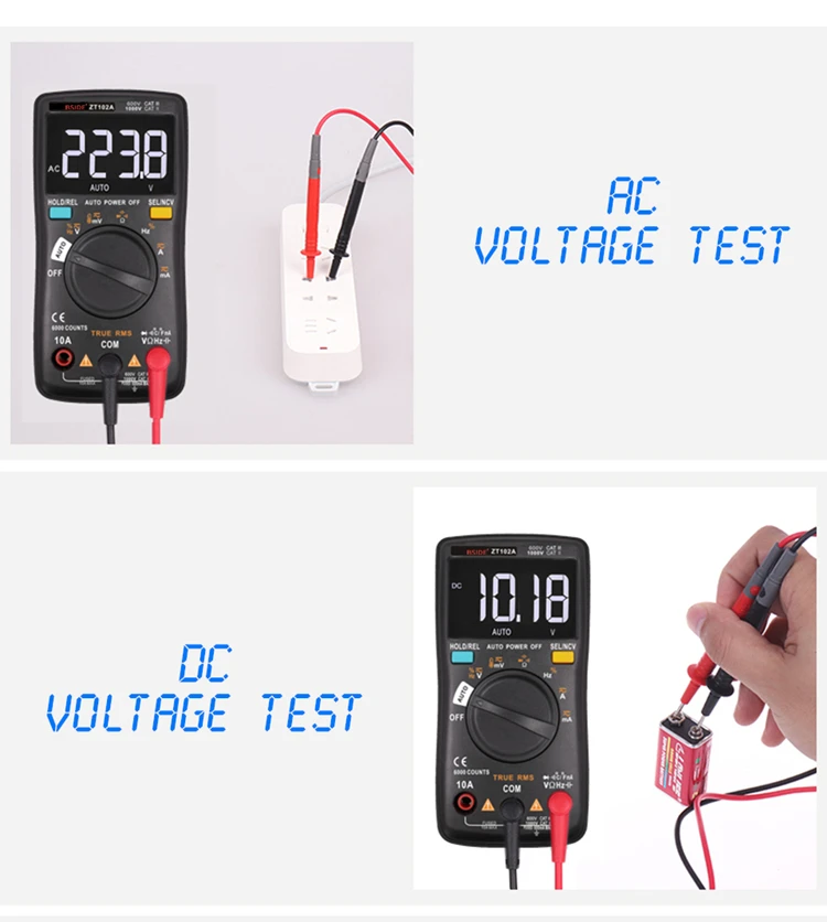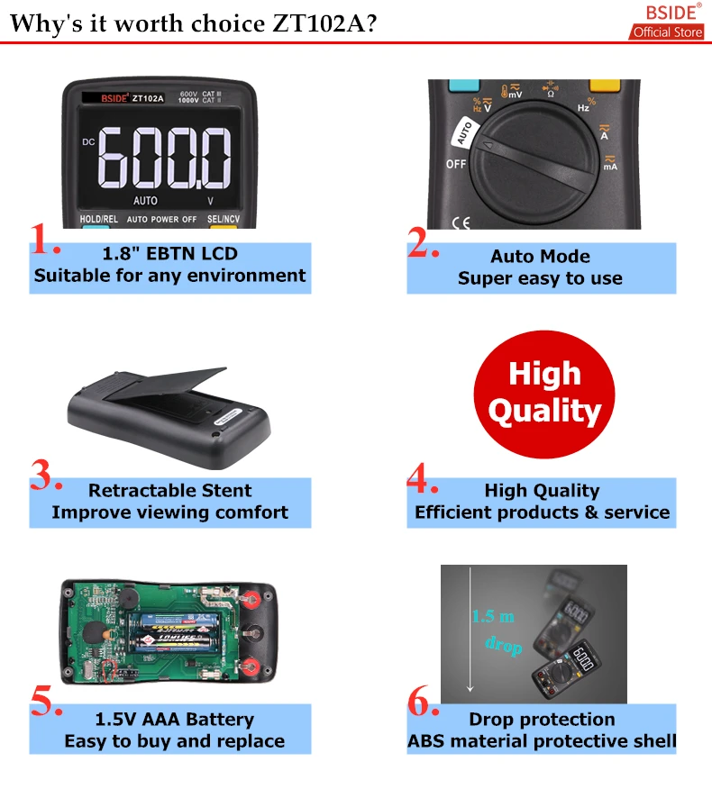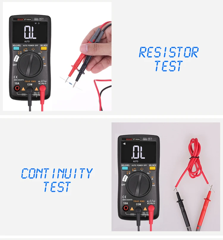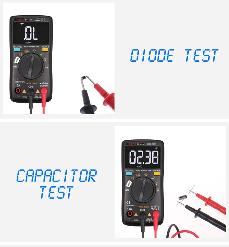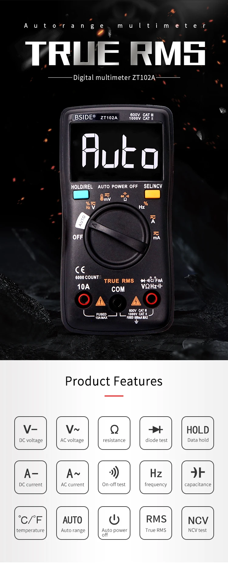 Мультиметр BSIDE ZT102A, цифровой мультиметр с ЖК-дисплеем, TRMS, переменногопостоянного напряжения, тока, температуры, Ом, частоты, диодов, сопротивления, емкости