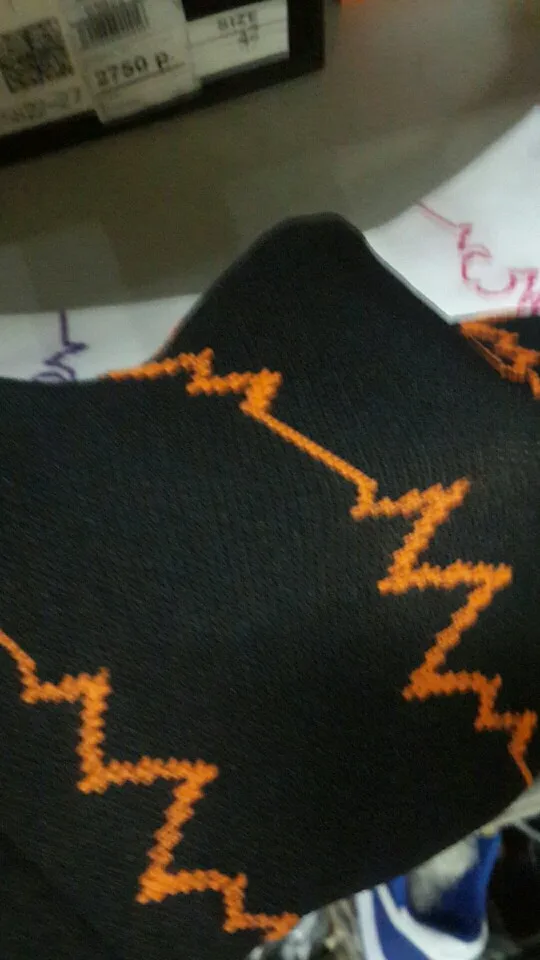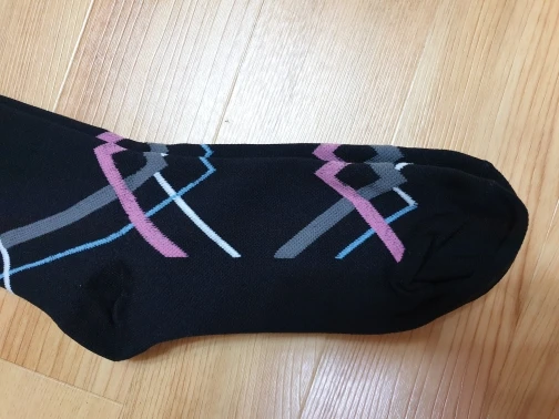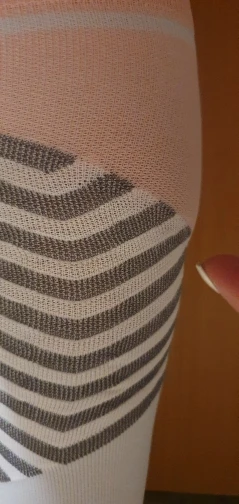 Доставка до Уфы 17 дней. По качеству нет нареканий, все отлично. На стопу 26,5 см сели хорошо. Все чёрные и белые полосы не тянутся, там компрессия. Мне в икроножных пережимает только одно место - там, где стык розового цвета и начало чёрной полосы. Попробовала заснять на фото, там выступ у меня. Только одно место, в остальном все хорошо.