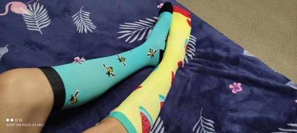 натягивать поначалу тяжело, они реально компрессионные))) яркие, резинка под коленом не давит( с учётом средней полноты ног) рисунок яркий, запахов резких или неприятных нет. у меня полные икры - на них рисунок растянулся раза в два)