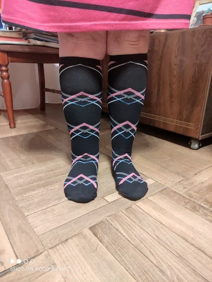Пришёл закал, не быстро, не долго - нормально. Гляжу, ну всё, неправильно заказала, будут малы, уже соображаю кому на Новый год втюхать! Утро вечера мудренее, почитав комент одной из покупательниц, про ноги вверх и только потом одевать, надумала попробовать. И, о чудо, одела. Ноги у меня полные, хоть и 38 размер ноги. Опыт одевать комрессионные чулки/носки есть(варикоз, операции). Результат - взяла бы больше, стопа была бы велика, пятка на щиколотке - не фонтан. На рисунке натянуто. Но, не давит, не режет, не натирает, не жмёт. Я довольна.