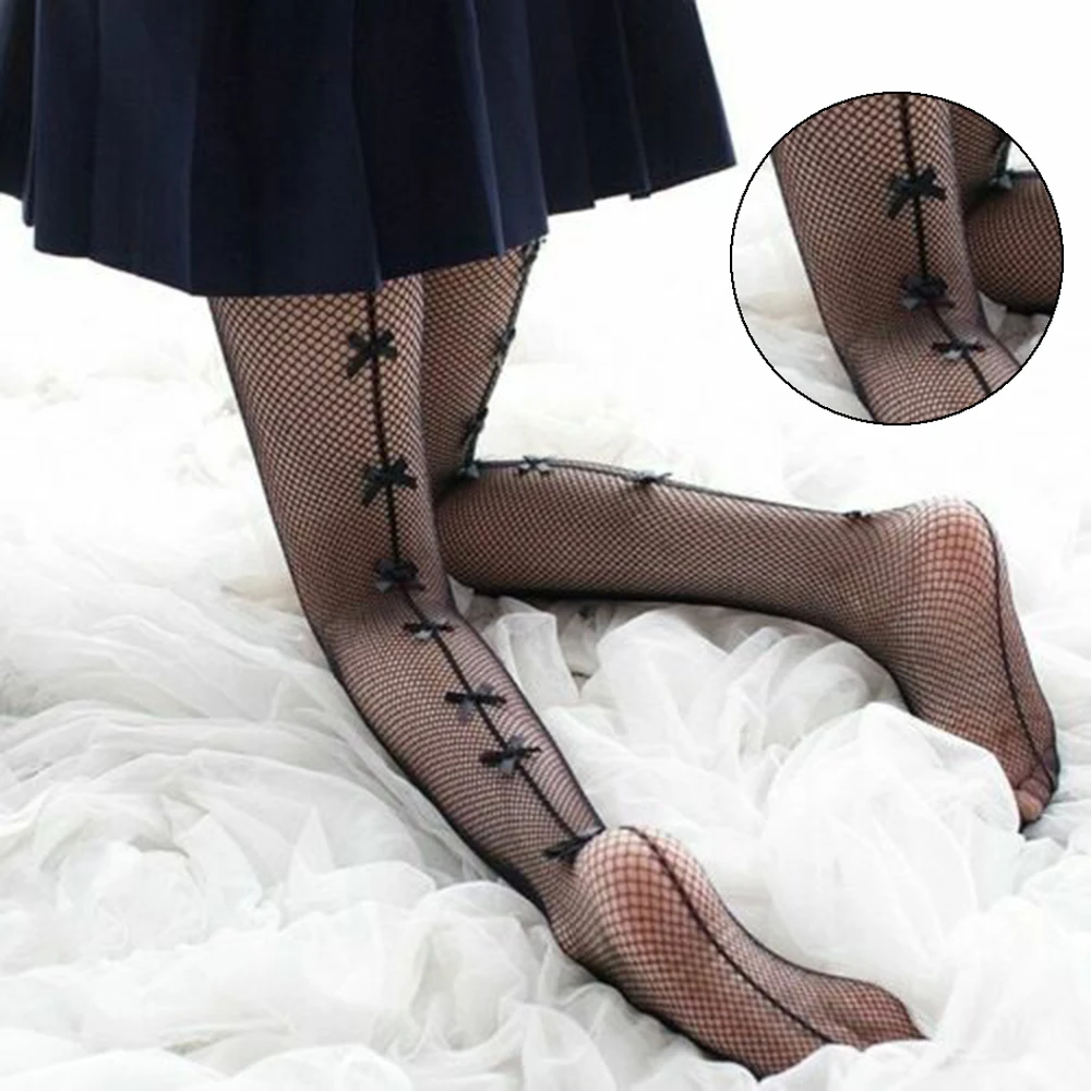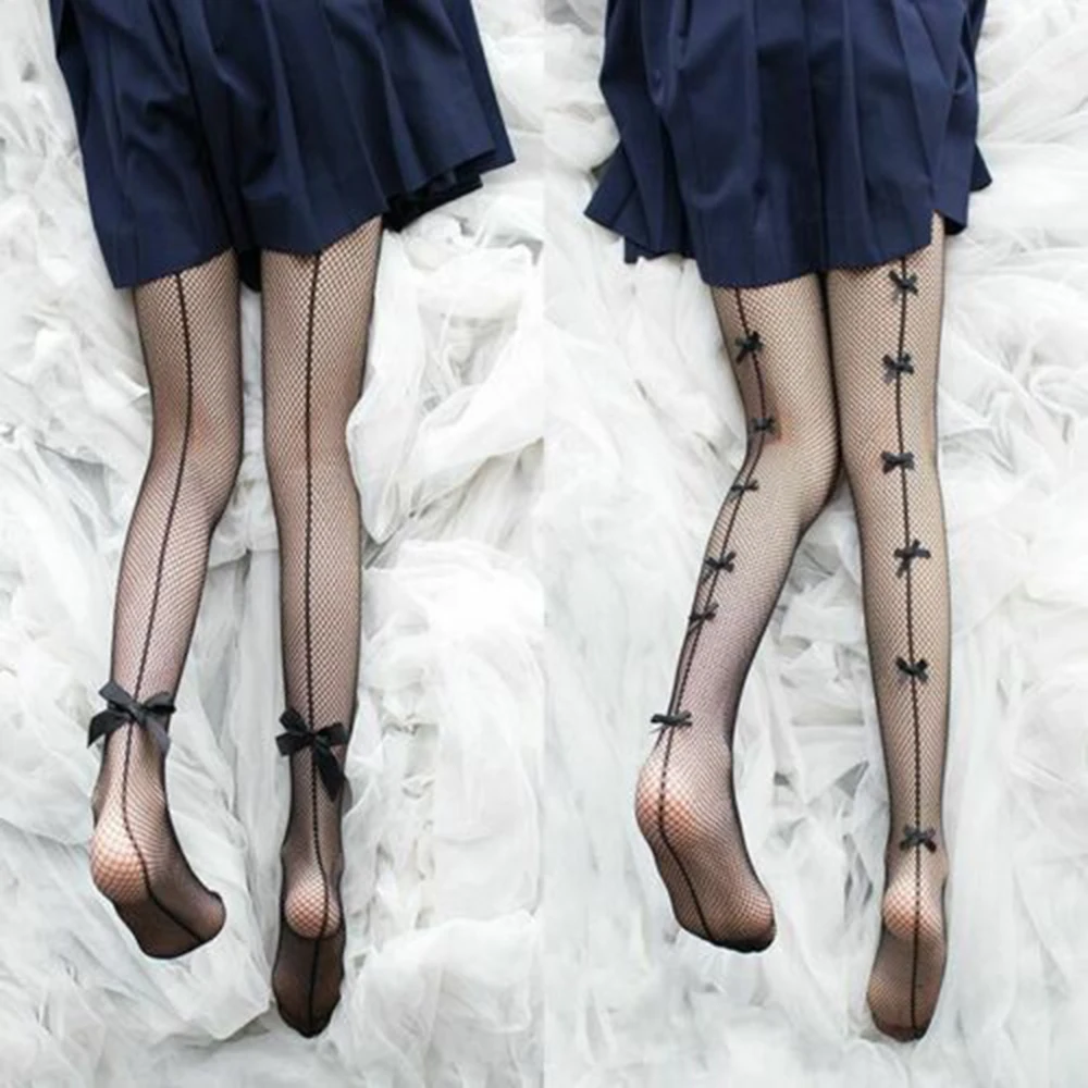 Новые ажурные высокие чулки с вертикальной линией и бантом