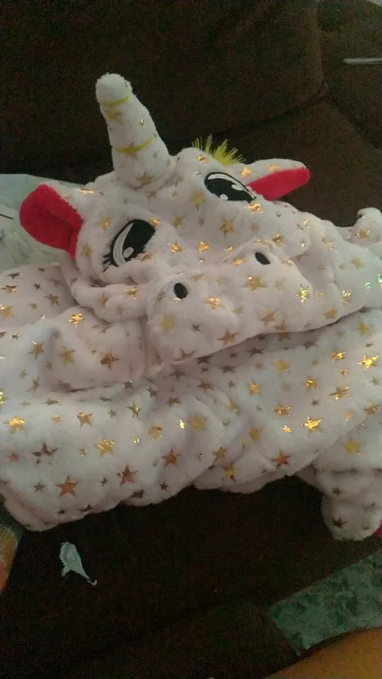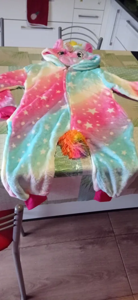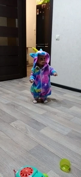пришло быстро, сшито нормально, запаха нет, цвет яркий, как на картинке,все на месте, ребенок счастлив.Большой плюс то что на попе есть большой замочек для похода в туалет, чтобы не снимать весь комбинезон. Брали размер +7, сидит свободно,нам 5 лет, хватит ностить лет до 7-8. Рог на голове отдельная тема, выглядит как ху..., но тут кому как, если не обращать внимания то норм.