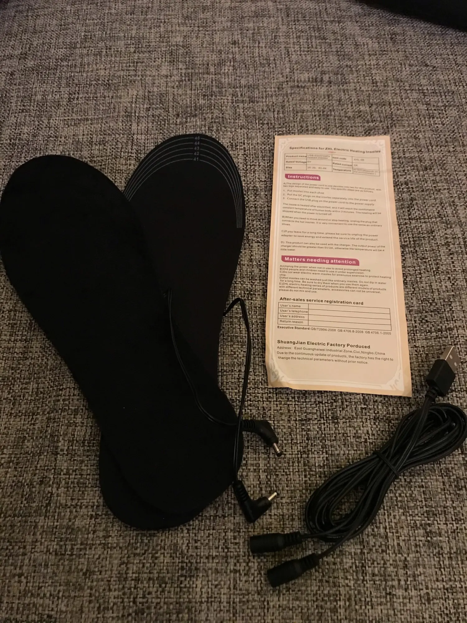 Приветствую! Заказал 12.11.2020, прибыло 30.11.2020 (г.Санкт-Петербург) ; Стоимость - 3.91$ (+ доставка в районе 1$); Все проверил: Греет хорошо (+45°С), длина шнура достаточная, при моих 177см достаëт до шеи; шнур отсоединяется от стелек; материал вполне приятный; можно обрезать по меткам; На мой 44 размер (RU) встали как родные целиком.