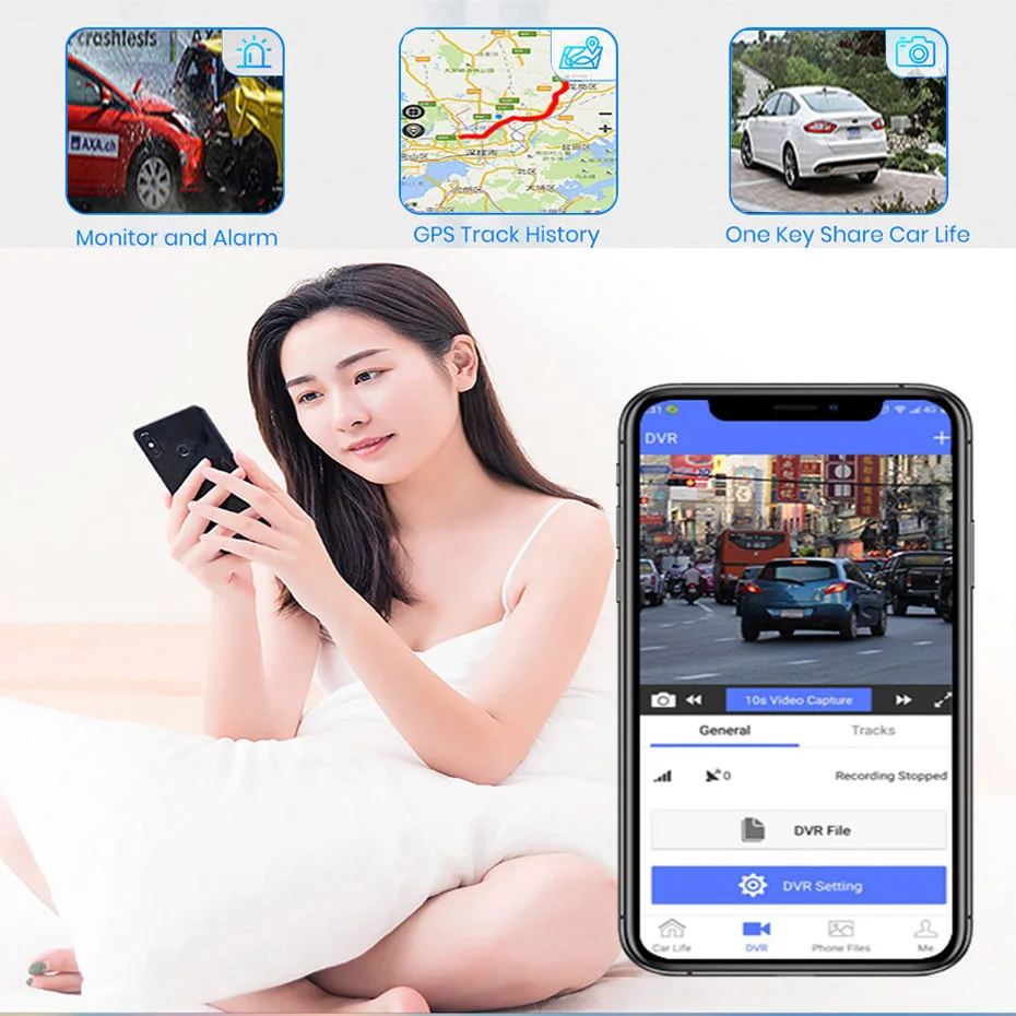 Фронтальная камера записывает видео FHD 1080P, широкий динамический диапазон позволяет камере работать оптимально в любой ситуации освещения, регулируя экспозицию, чтобы создавать сбалансированные изображения и кадры. Фронтальная и задняя камера 2 канала одновременно записываются, они могут работать в фоновом режиме.