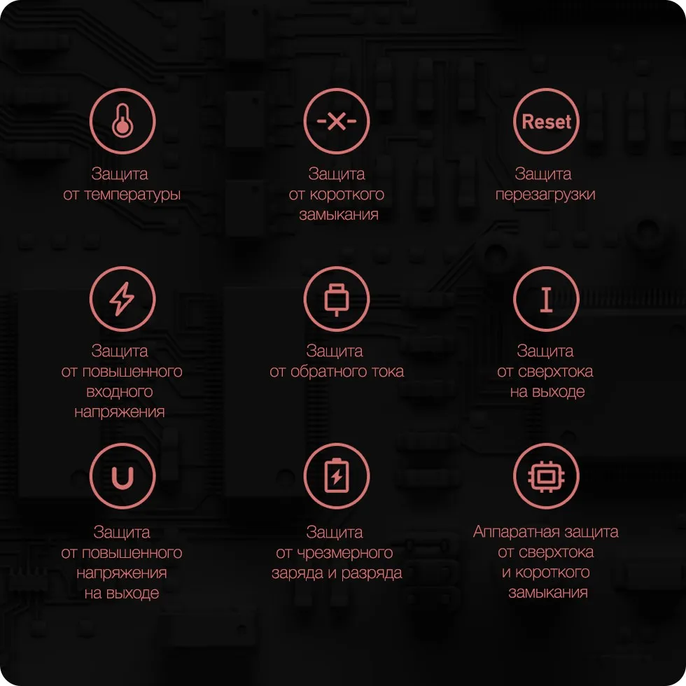 Высокочувствительные ёмкостные датчики и передовая плата управления питанием без риска для аккумулятора и заряжаемых устройств справятся с чрезмерным зарядом или разрядом, коротким замыканием, перегревом и другими проблемами, не подвергая устройства и малейшей опасности.