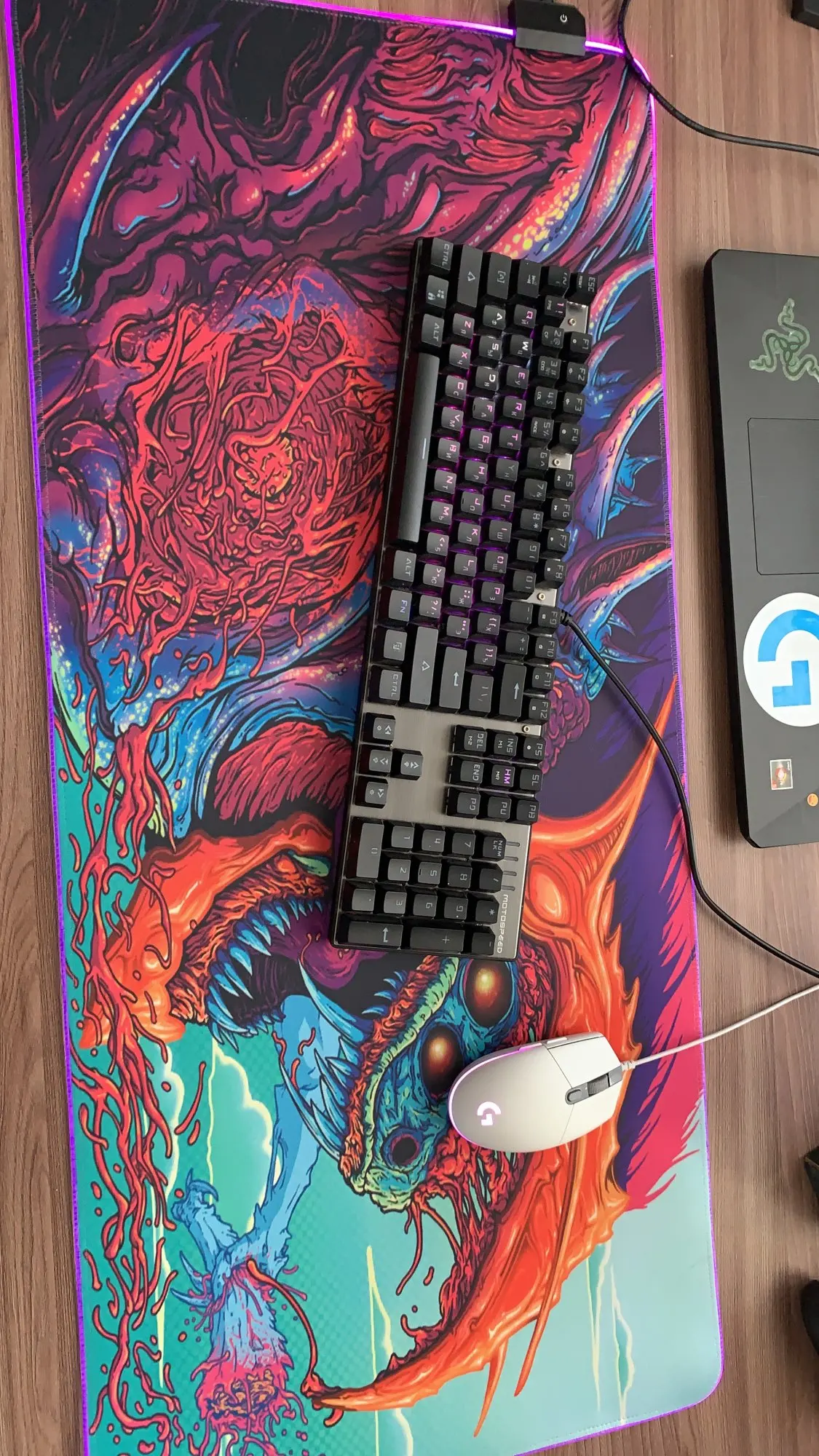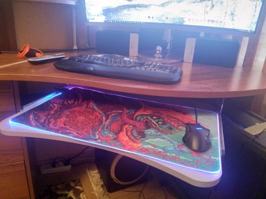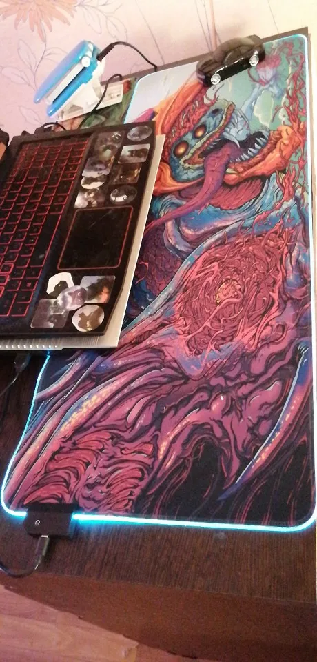 Продавец быстро отправил, заказал 14.01. Прибыло в пятерочку уже 23.01. И это в Сочи! Принт не супер яркий и контрастный как на картинке, но это было ожидаемо, в целом супер. Края с подсветкой не выпирают, брал 35*90, толщиной 3мм. Идеально гладко, руки не напрягает и не натирает. По качеству отличное исполнение, никаких изъянов, все целое. Несмотря на то что коробка была убита в хлам)) Не воняет. Не обратил внимание что подключение провода для подсветки идет сбоку, из за чего коврик лег немного не так как я планировал, имейте ввиду. В остальном все хорошо, можете смело брать. Знакомым посоветовал, тоже будут брать)