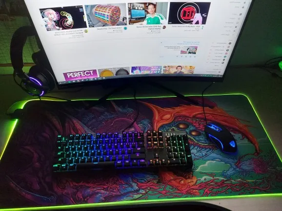 Красивая толстая (4 мм) и большая коврик для мыши (90x40), мастерство-верх! К сожалению, освещение края не так хорошо, как на видео продукта