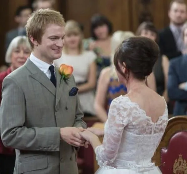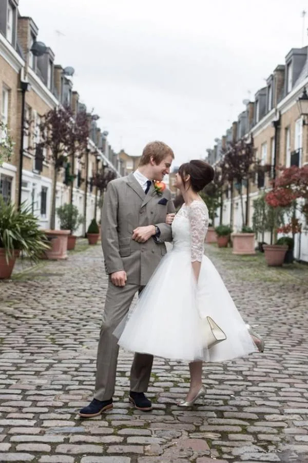 Популярное свадебное платье длиной ниже колена, трапециевидная Иллюзия Ba Tea u, прозрачное кружевное Пышное Тюлевое платье с рукавом 34, дешевое Короткое свадебное платье с бантом и поясом