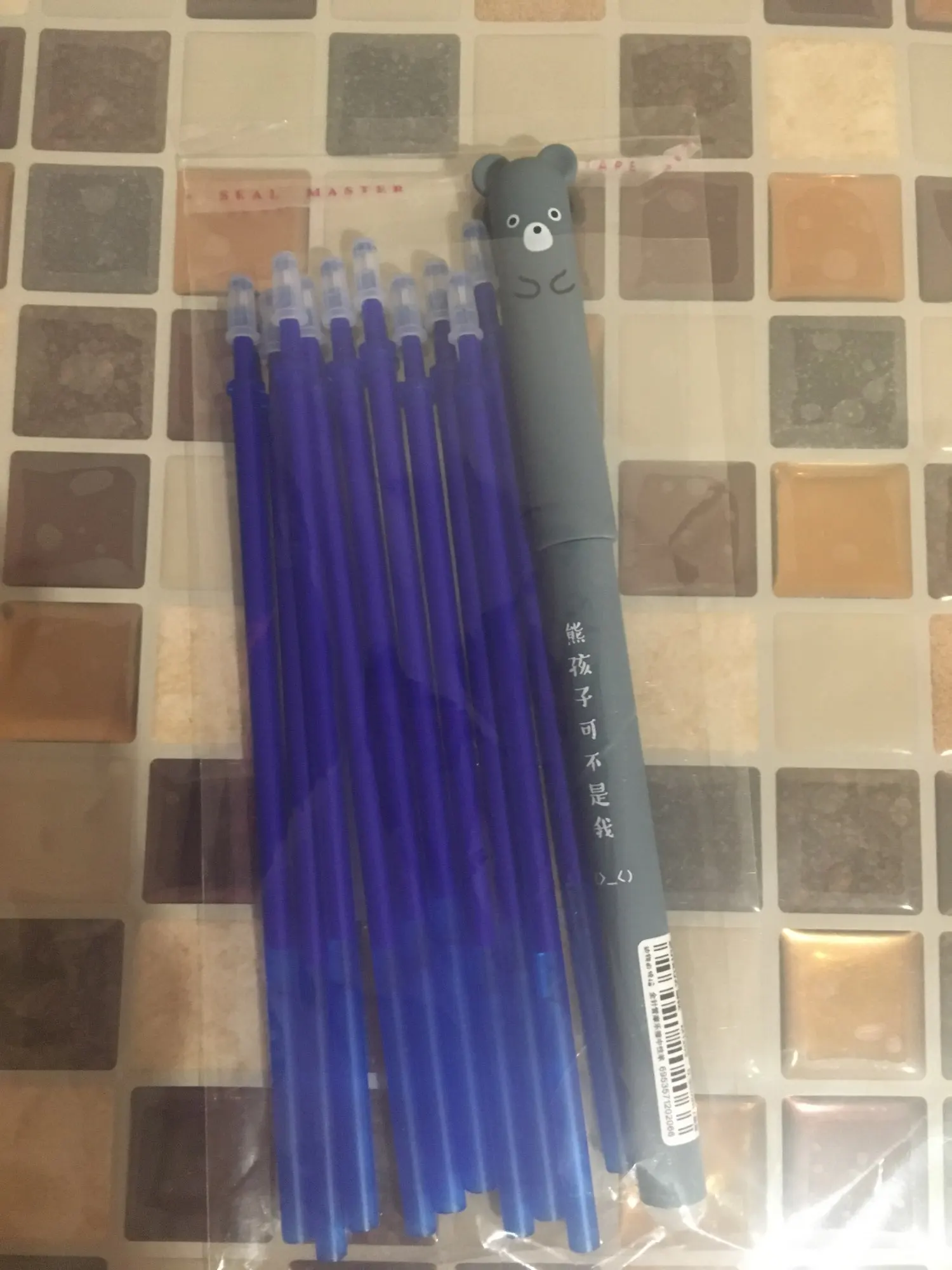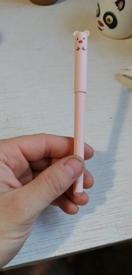 Ручка очень миленькая, пишет тонко, чернила синие, досталась в виде панды, подходят к обычным тонким гелевым стержням
