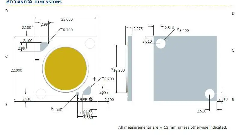 Высокая светоотдача и эффективность благодаря компактной, простой в использовании светодиодной матрицеXLamp®Светодиодная матрица CXA1816 обеспечивает высокий световой поток и высокую эффективность в одной простой в использовании упаковке, что избавляет от необходимости пайки оплавления. Светодиодный массив CXA1816 оптимизирован для упрощения дизайна и снижения системных затрат, обеспечивает производительность на уровне системы от 1300 до 2000 люменов, что позволяет использовать галогенные лампы, керамический металлогалоген и компактная флуоресцентная технология.Размер 17,85x17,85 ммВарианты продукта High-CRIМаксимальный ток привода 0,9 АМаксимальная мощность (W) 38 ВтСветильник вой поток 1700 - 3800 лмМаксимальная эффективность при условии связывания (лм/Вт) 149 лм/ВтСветильник излучающая поверхность (LES) 12 ммСтандартное прямое напряжение 36,2 в @ мАМаксимальный обратный ток 0,1 мАУгол обзора 115 °