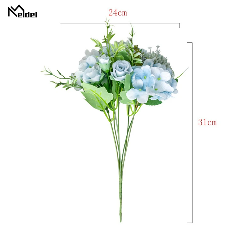 Искусственный цветочный букет Meldel, 7 цветов гортензии, искусственный букет, шелковая Цветущая Роза, пион, помпон, свадебное украшение для невесты
