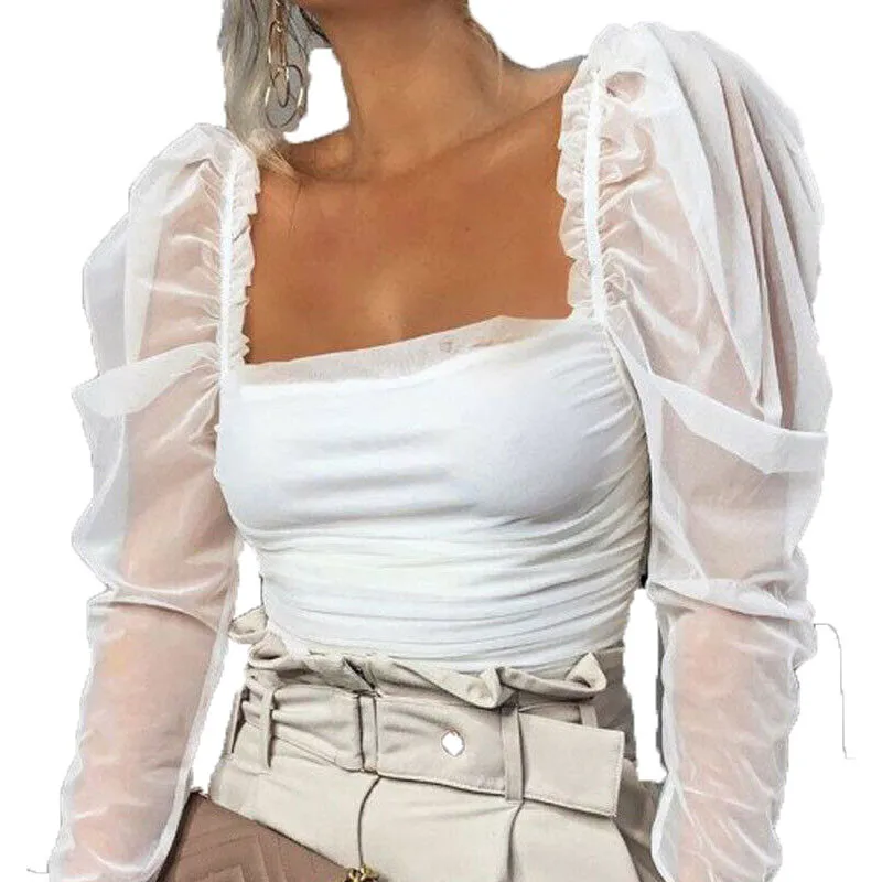 Женская пикантная Стильная однотонная Тонкая блузка, прозрачные эластичные повседневные укороченные топы с буффами на рукавах и квадратным воротником, 2020
