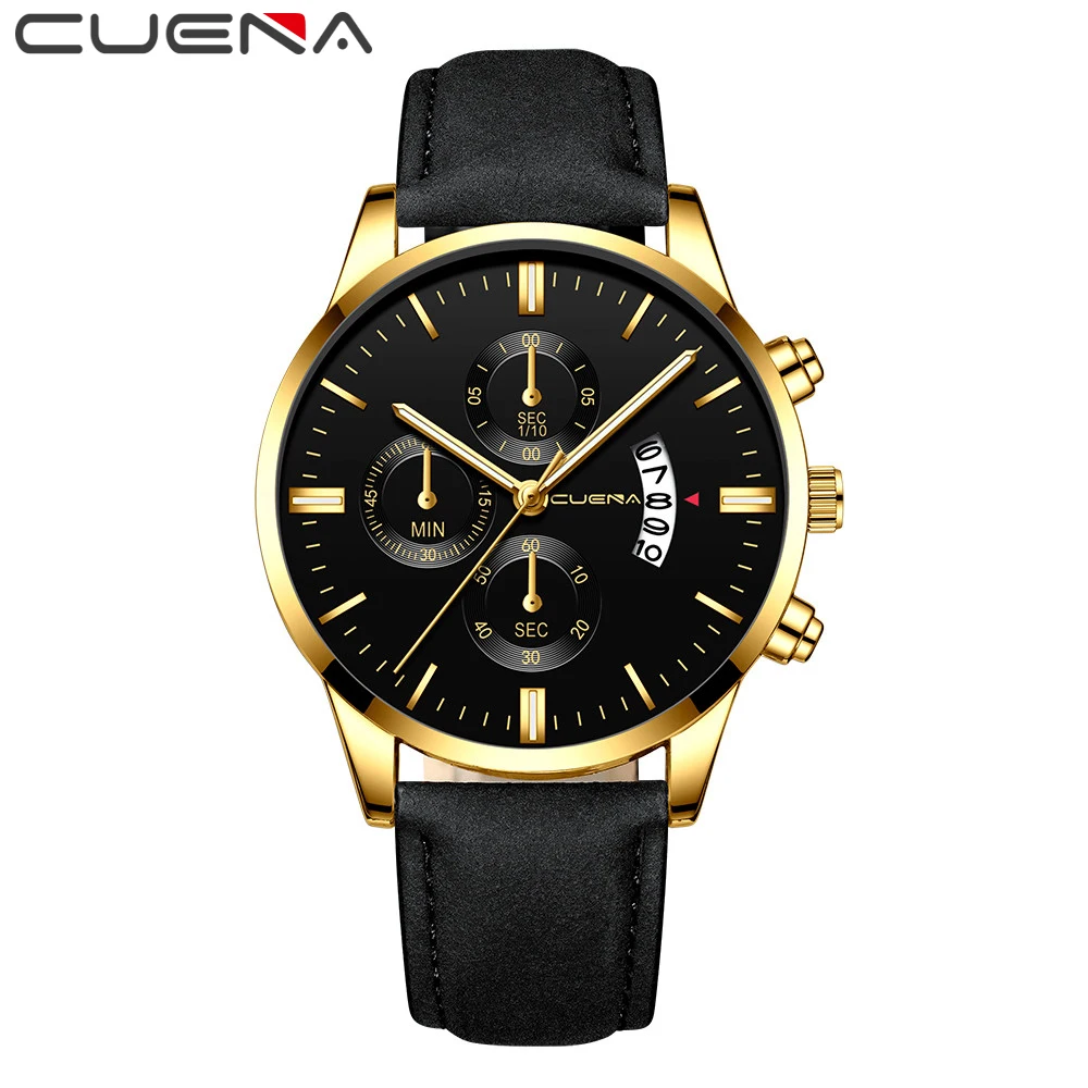 Модные мужские часы CUENA, часы из нержавеющей стали с кожаным реме...