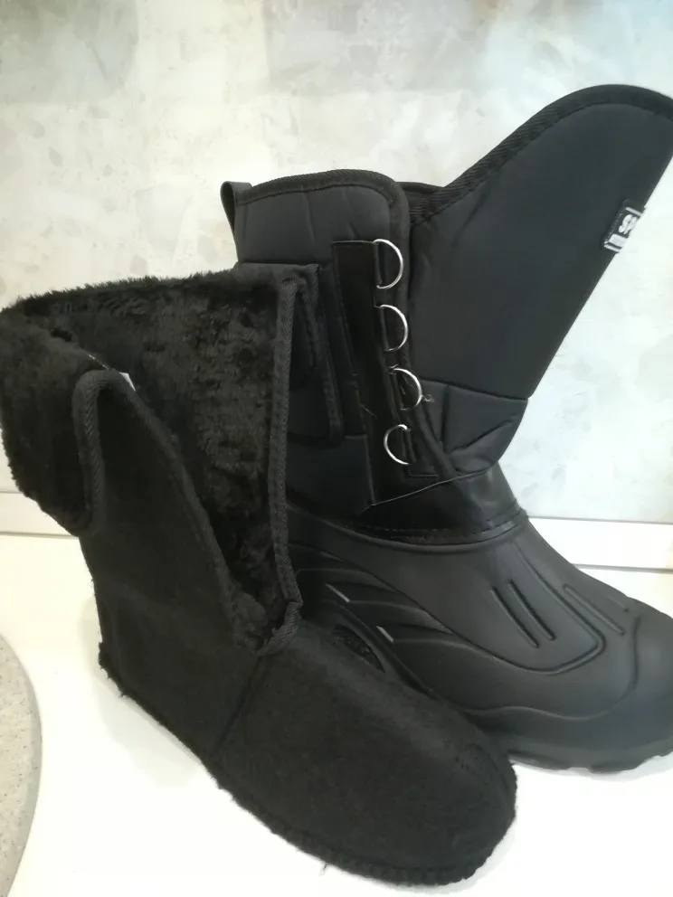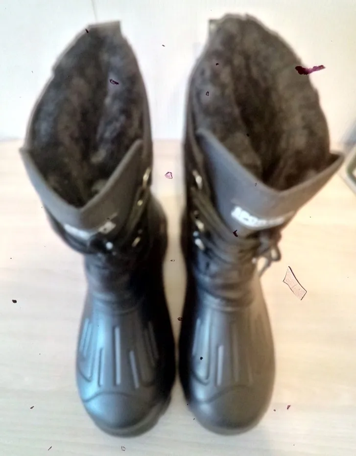 Очень интересная пара обуви. Лёгкие. Снизу точно будут непромокаемые, т.к.литые. Приятно удивили внутренние сапожки-вкладыши :внутри синтетический мех, а сверху поверхность похожа на валенки, особенно на самой ступне. Прям чувствую, как будет тепло
