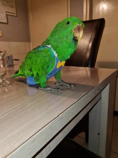 Отлично подходит для меня с попугаями и любит оставлять их без клетки