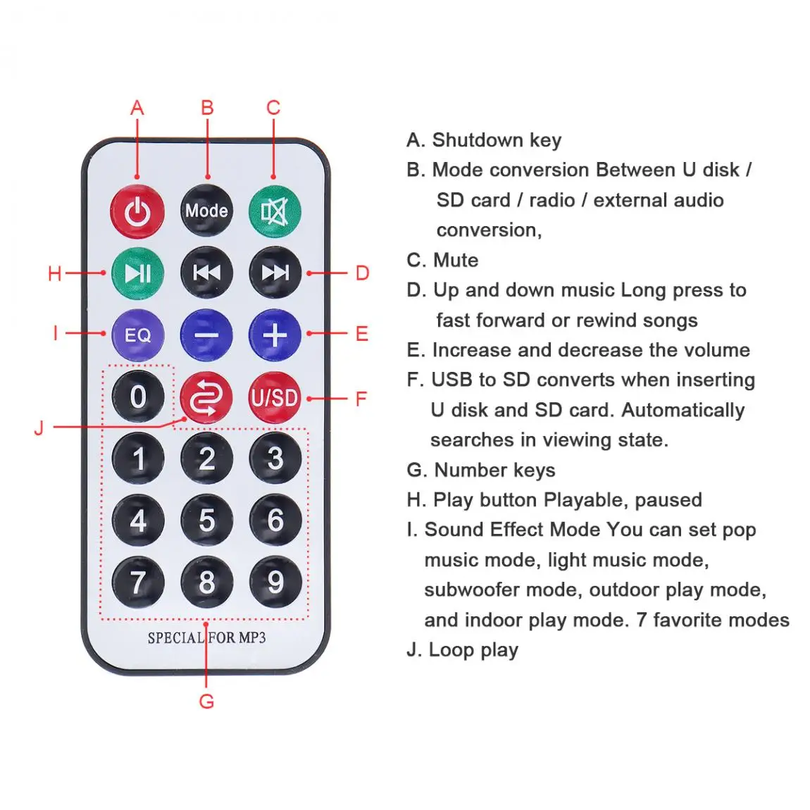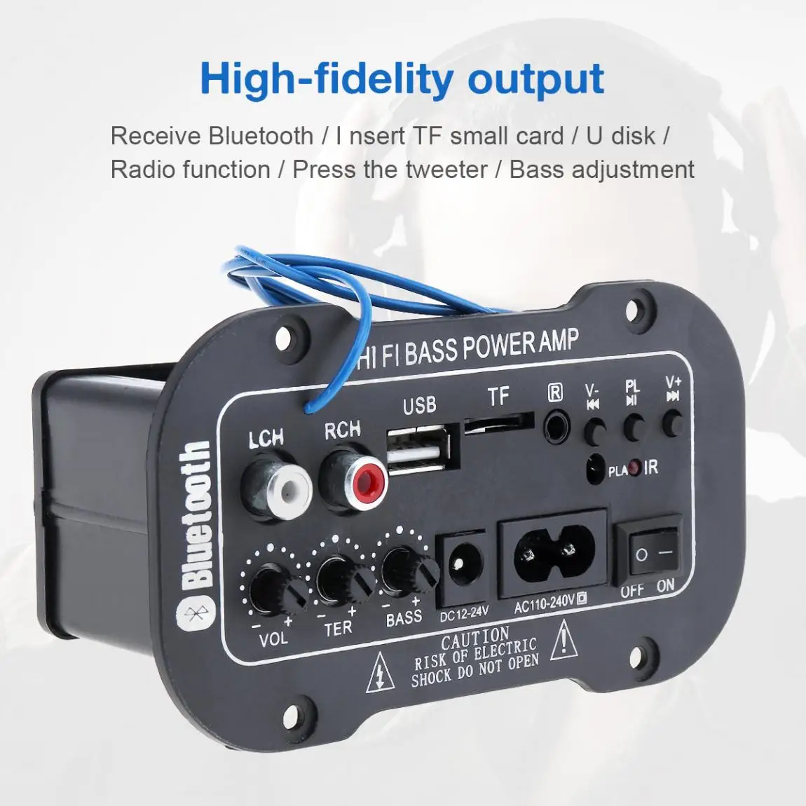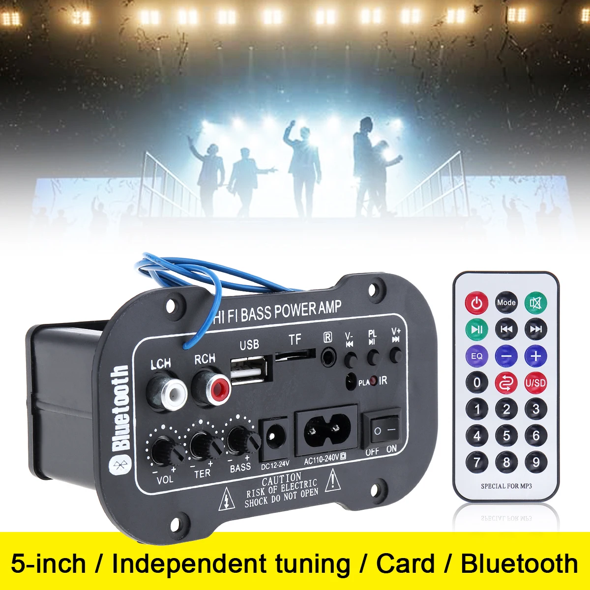 Особенности:-Внутренний высококачественный Bluetooth-совместимый модуль-Можно воспроизводить tf-карту u-диска для музыки и fm-стерео радио, поддерживает формат MP3.(USB + TF + FM).-Поддержка выхода микрофона.-Телефон подключен к Bluetooth, и телефон контролирует воспроизведение музыки.-Регулируемый высокий и низкий звук, выберите различные звуковые эффекты.-Моно, может быть соединен с твитером.-Может быть установлен, поп-музыка, музыкальный светильник, тяжелый бас, уличная игра, игра в помещении, 7 режимов звука-Предварительный профессиональный уровень ввода операционного усилителя IC для дизайна цепи, звука, прозрачный, яркий.-Фильтрация и анти-большая мощность цепи.-Стабильный, низкое энергопотребление, энергосбережение, низкое тепловыделение, длительный срок службы.-С пультом дистанционного управления, функцией Bluetooth, FM/USB/TF картой чтения/радио.-Примечание: Перед использованием внимательно прочитайте инструкции.