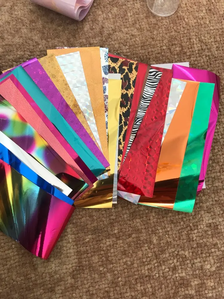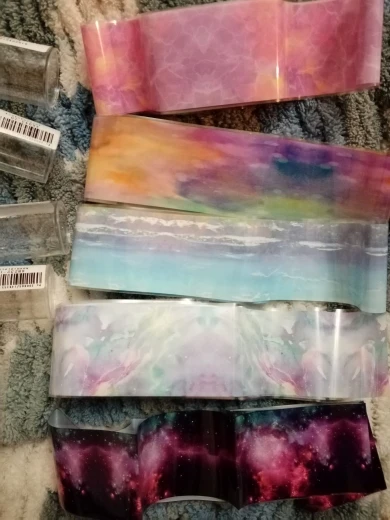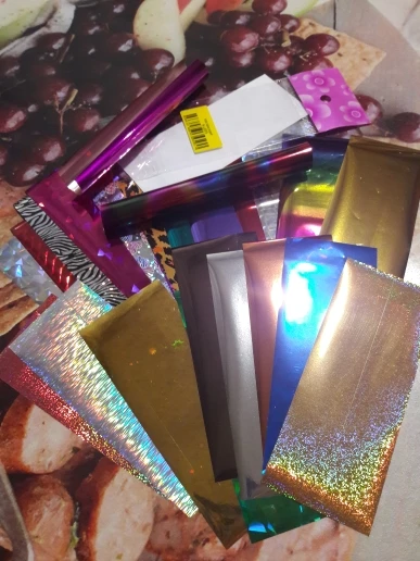 Я не подсчитывал, сколько там находится, но много разных есть, поэтому это отлично подходит для этой цены. Не так большие размеры, но достаточно для нескольких видов использования из одной фольги. Принты и цвета отлично подходят для использования, легко окрашивают гель-слой для ногтей. Все рекомендации