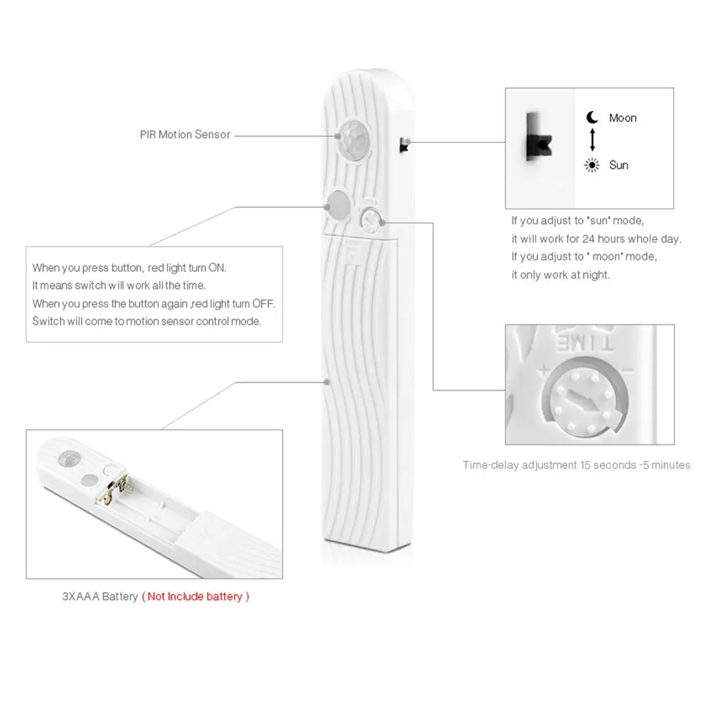 Расстояние срабатывания: 2 м-5 м Время задержки: 15 сек-5 мин (регулируется) Управление светильник: 2 режима. Режим 1: день и ночь Режим 2: движение по кругу в ночное Режимы работы: "ON" и "PIR" Когда вы нажимаете кнопку, красный светильник включается, светодиодный светильник всегда будет включаться, когда вы снова нажмете кнопку, красный светильник будет выключен, это будет режим «PIR».