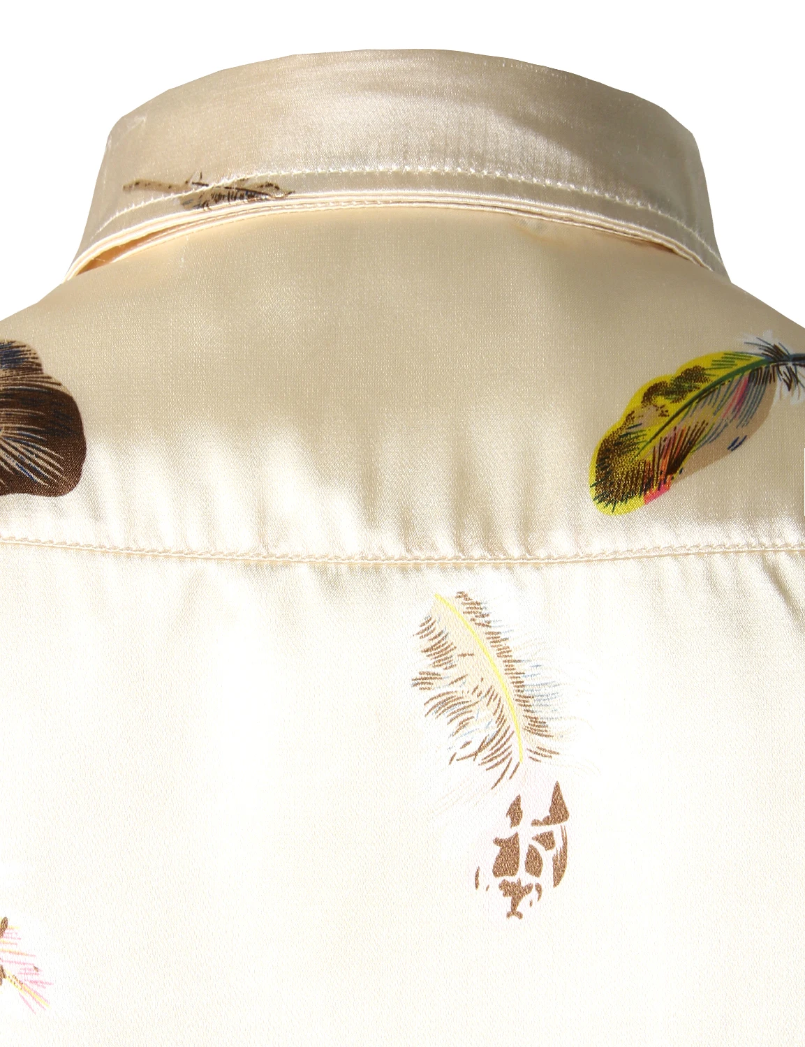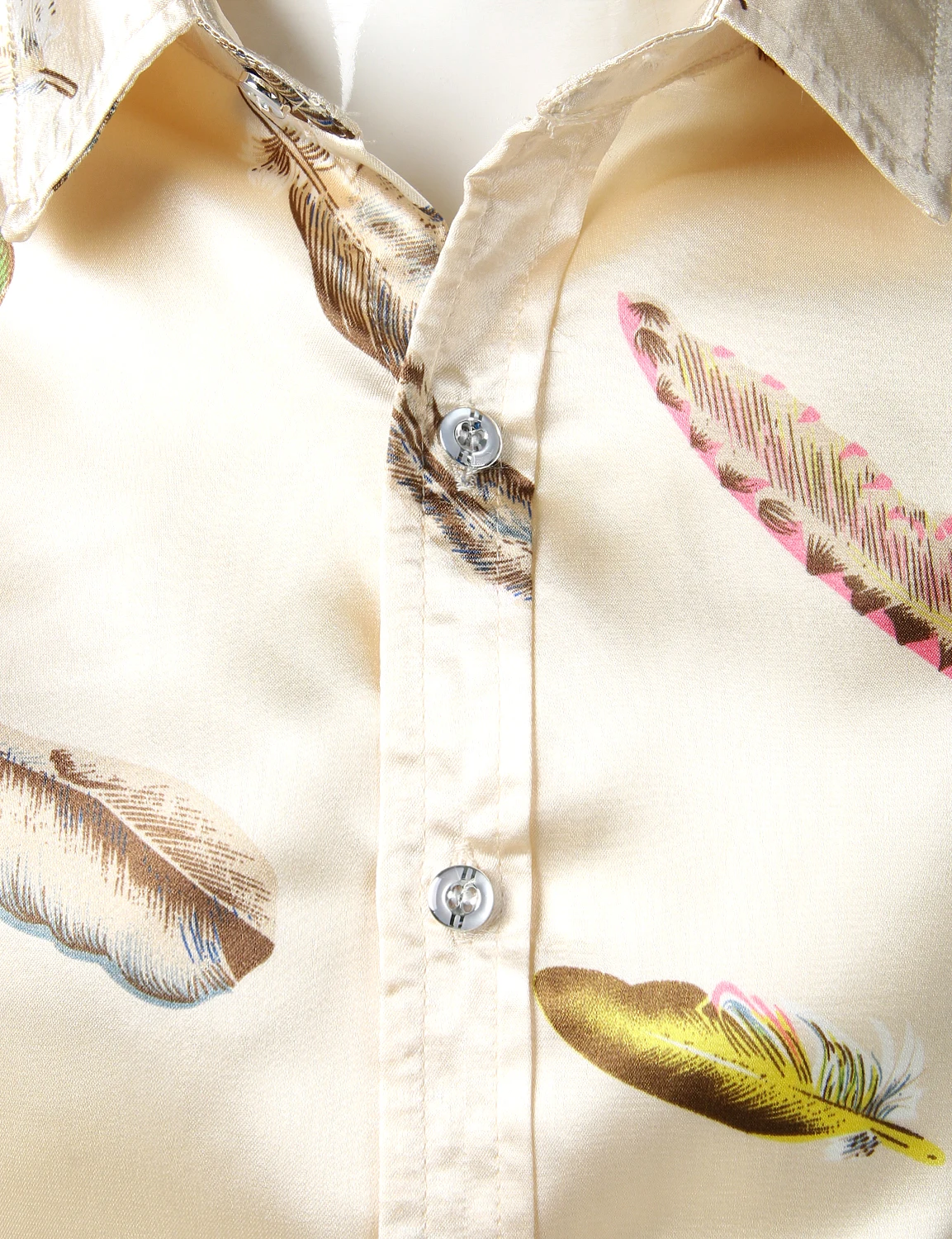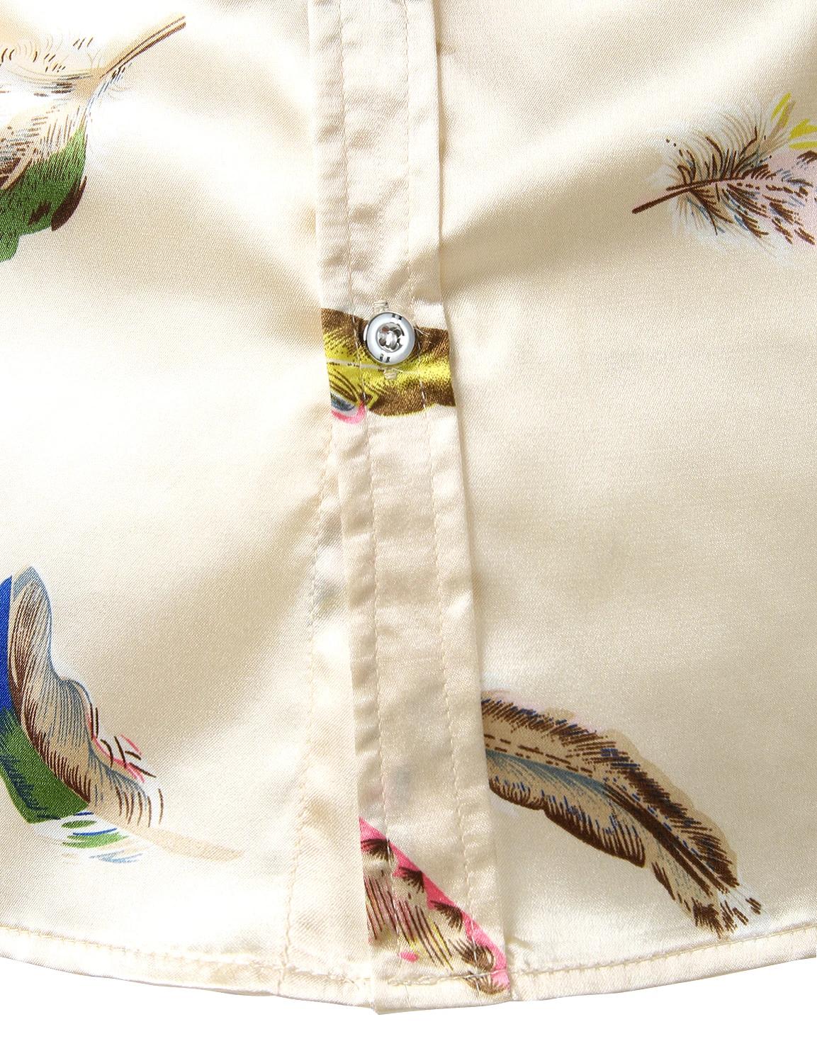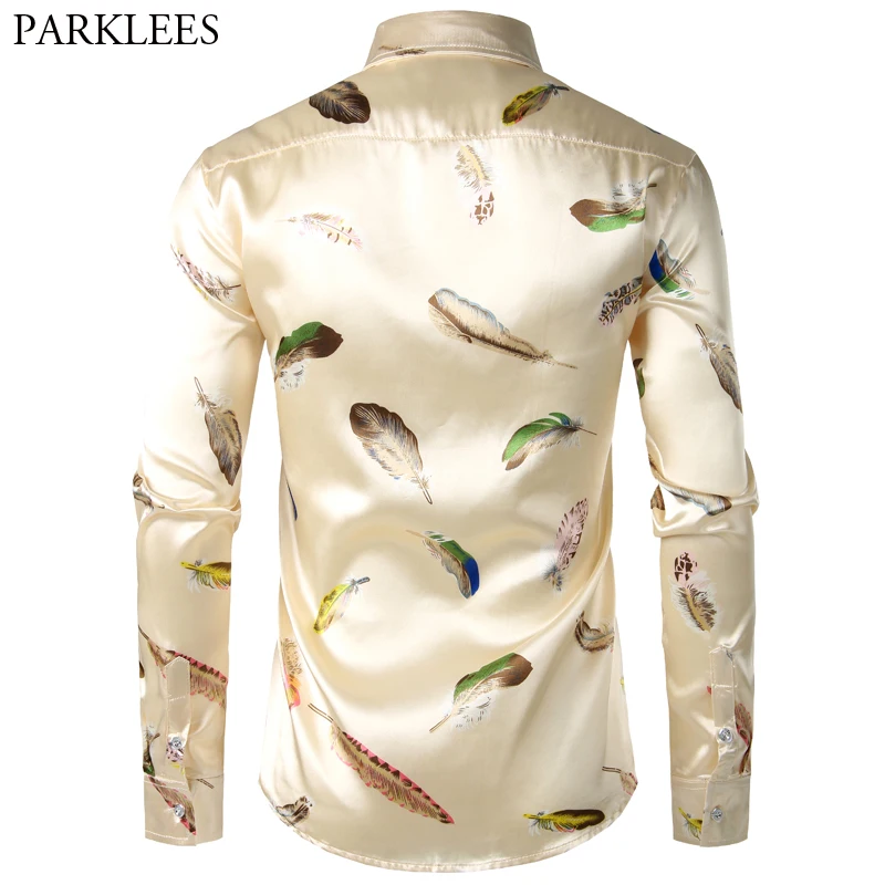 Рубашка мужская с принтом перьев, шелковая атласная гладкая Повседневная вечерняя дизайнерская сорочка с длинным рукавом, на пуговицах