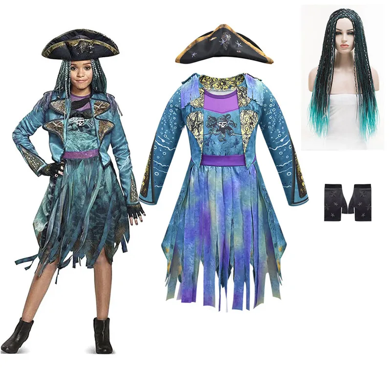 Наследники 3 мал Берта Малефисента кудри живые злые прямые синие дети взрослые Косплей Кепка + платье костюм на Хэллоуин для детей парик