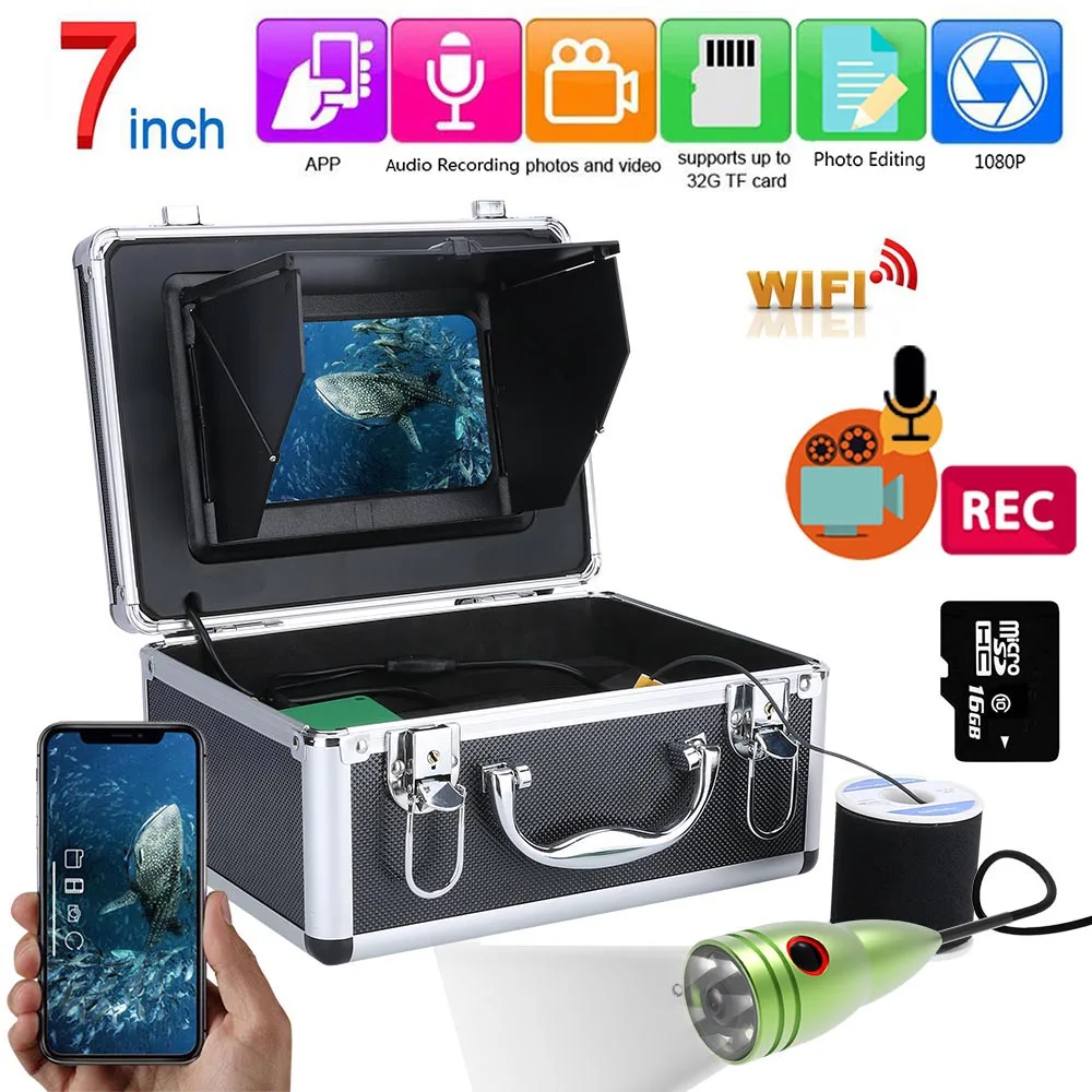 Эхолот-рыболокатор для подводной рыбалки, камера 1080P, 7 дюймов, Wi-Fi, беспроводная, 16 ГБ, запись видео, DVR + 15 м, 20 м, 6 Вт, белые светодиоды